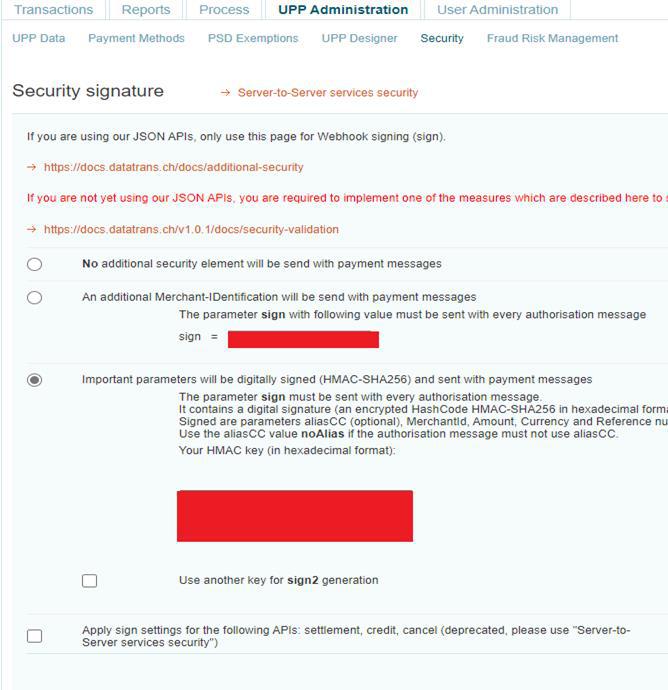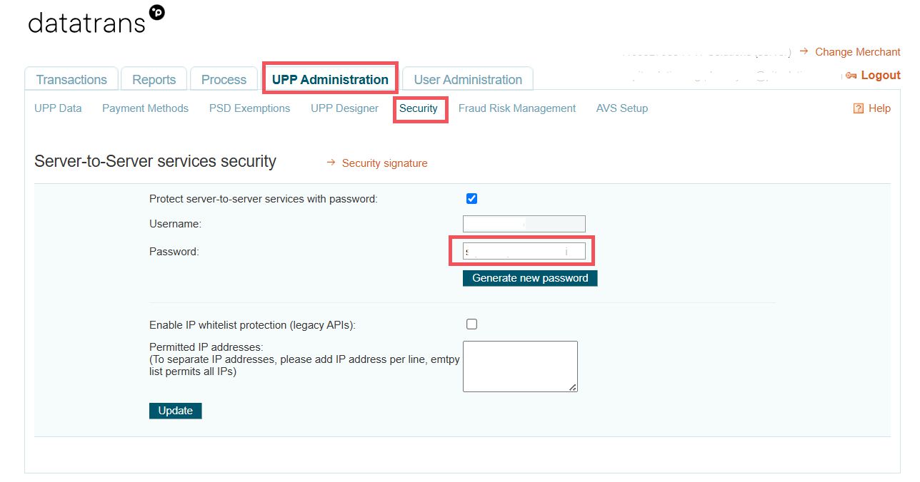 • In the Datatrans Webadmin Tool, go to UPP Administration > Security.