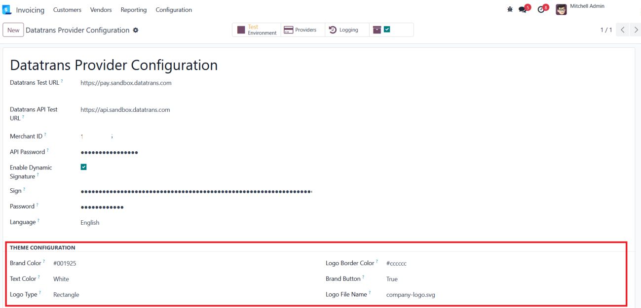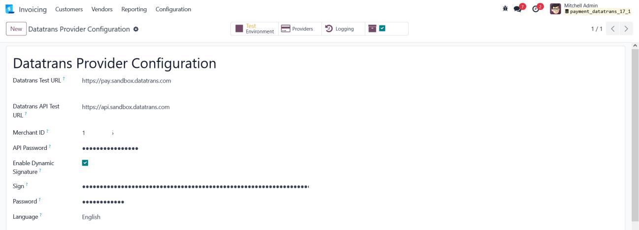 1. Configure Datatrans Provider: Begin by entering your Merchant ID, API Password, Login Password and Dynamic Sign from the Datatrans web administration tool into the Odoo backend.