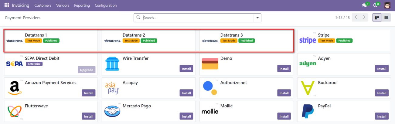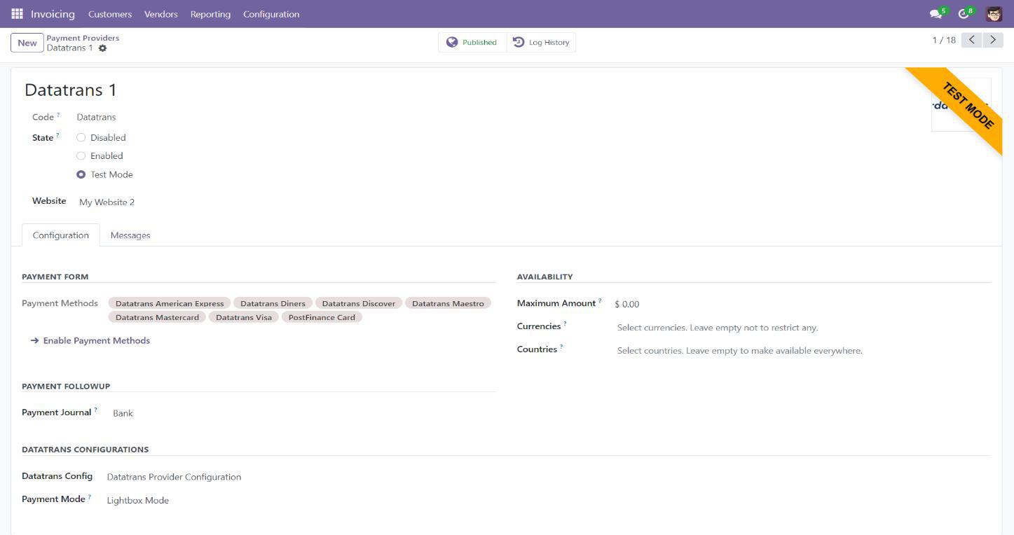 • Publish or enable the Datatrans payment provider in your Odoo backend to make it available for use.