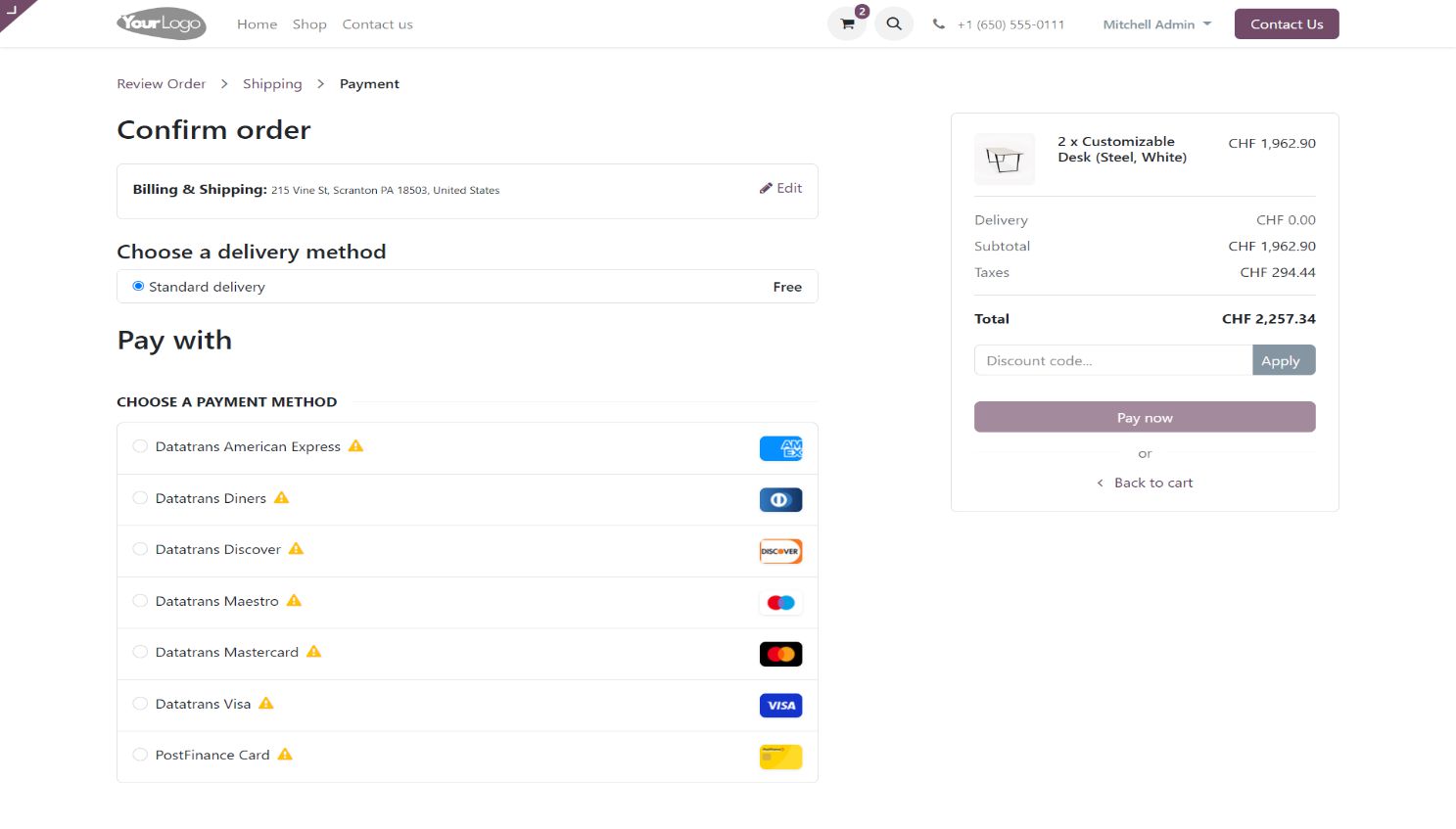 • Choose the Datatrans payment method at checkout and proceed with the payment.