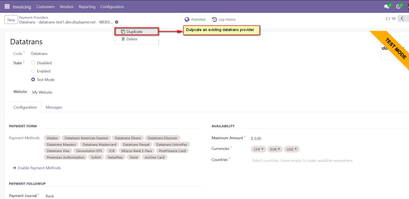 • To set up Datatrans for multiple websites, duplicate the Datatrans Provider configuration using the Duplicate button.