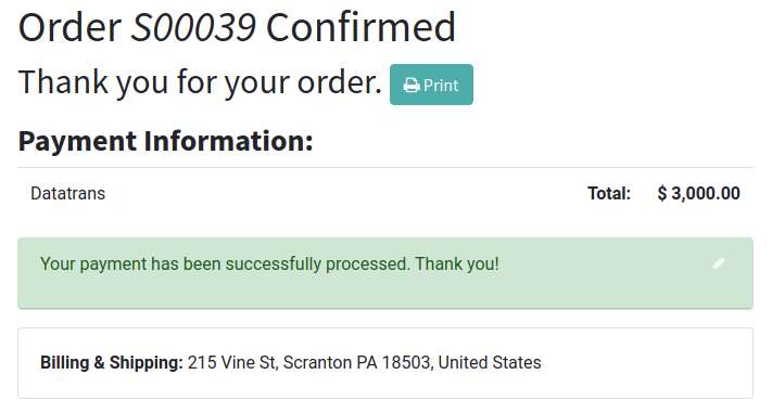 - After a successful payment, the order will be placed, and you will be redirected back to the Odoo webshop.