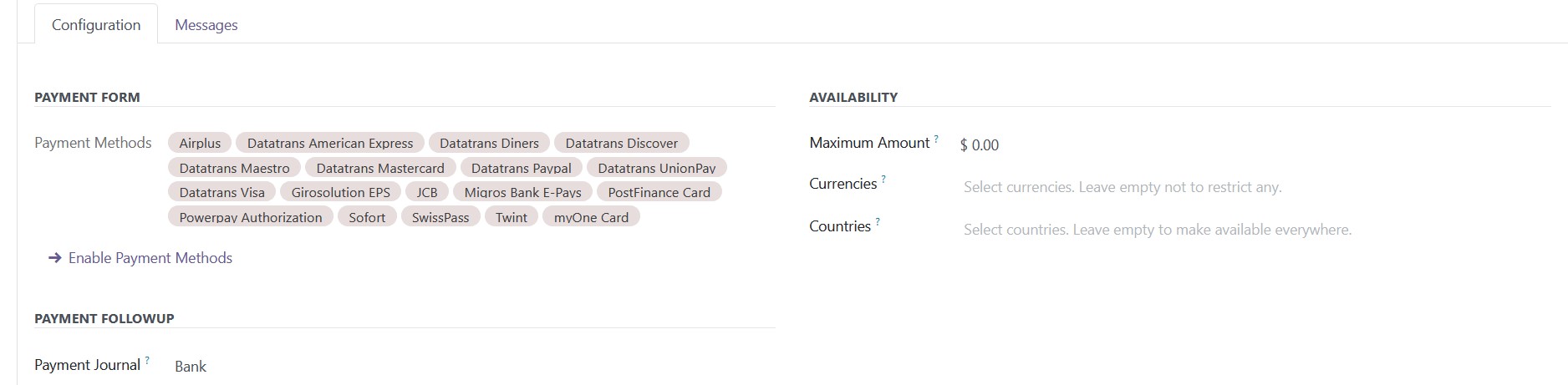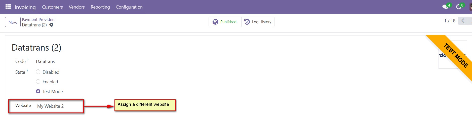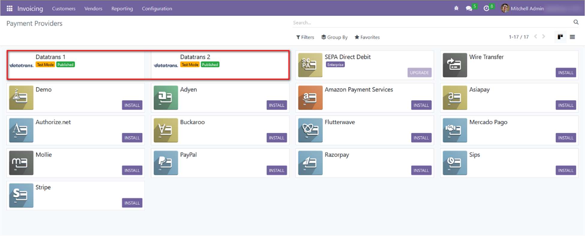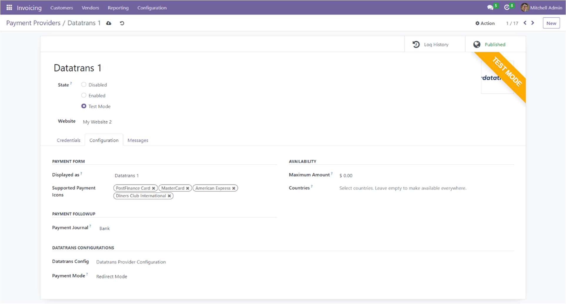 - Configure the Datatrans provider in the Odoo backend with your Datatrans credentials
