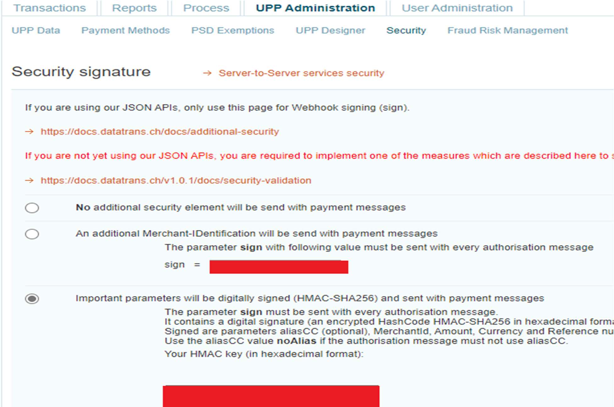 Screenshot 2: Datatrans Webadmin Tool - security signature