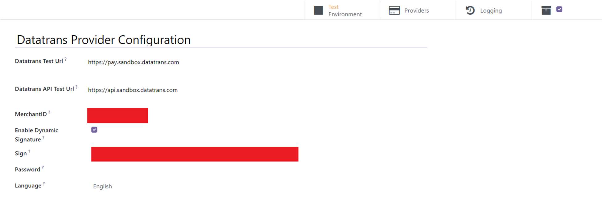 - Initial Configuration: Enter your Merchant ID, Password, and Dynamic Sign from the Datatrans Web Administration Tool into the Odoo backend configuration.