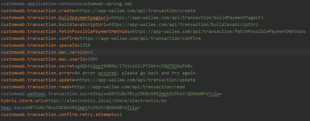 Wallee Payment Solution for SAP Commerce Cloud uses some properties in order to manage the process. Those properties can be seen in the project properties. Some of the main properties are listed below: