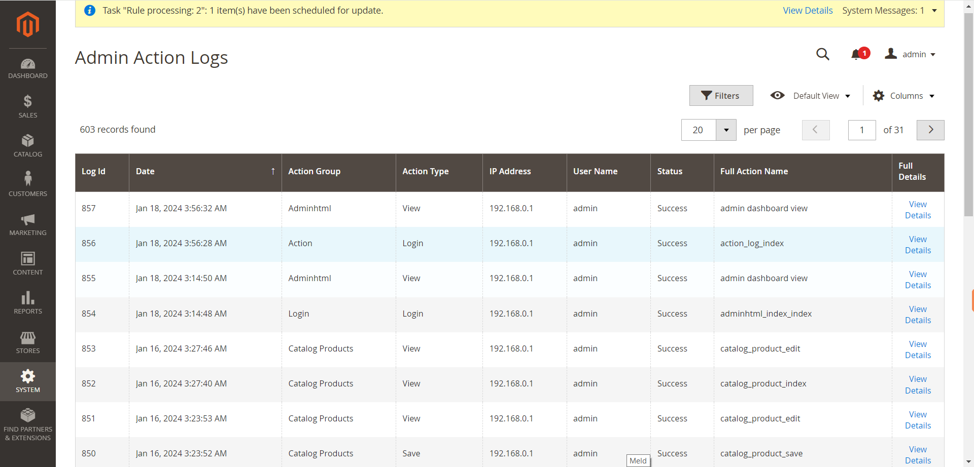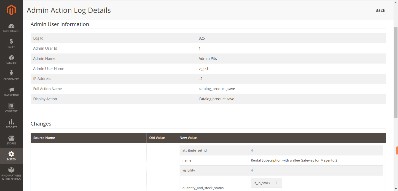 Die Admin-Aktionsprotokolle zeigen eine detaillierte Aufzeichnung aller Admin-Aktionen an, die für die Protokollierung aktiviert sind. Jeder Datensatz ist mit einem Zeitstempel versehen und zeichnet die IP-Adresse und den Namen des Benutzers auf. Das Protokolldetail enthält Admin-Benutzerdaten und zugehörige Änderungen, die während der Aktion vorgenommen wurden.
