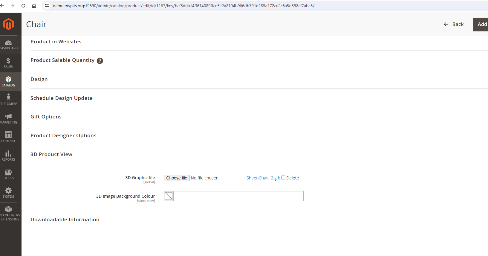 Administrators can add the 3D file in Product Add/Edit page. On this page, there exists a section named ‘3D Product View.' Within this section, an attribute named '3D Graphic file' is provided, allowing administrators to add the 3D GLB or GLFT file. Also have attribute for background colour ‘3D Image Background Colour’ to change the background colour for a specific product.