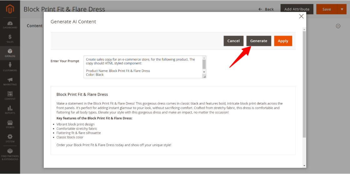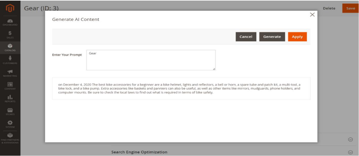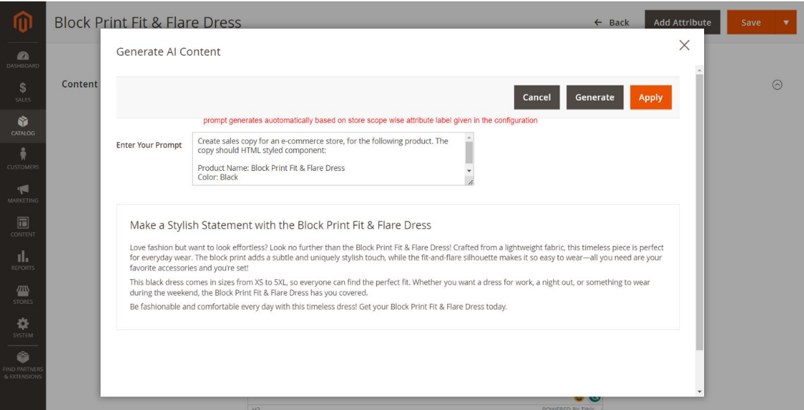 Here, auto generated prompt is based on your selected product attributes in the configuration. If you wish to change the prompt you can change it and regenerate AI content by, click on Generate button.