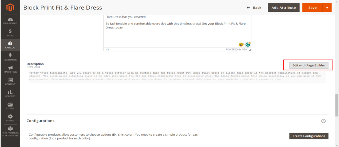 If you are using the description/short-description attribute as “Page Builder” input type, click on “Edit with Page builder button”