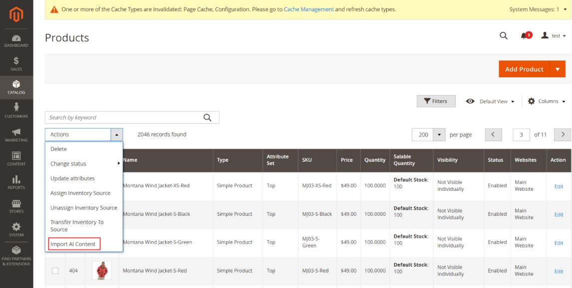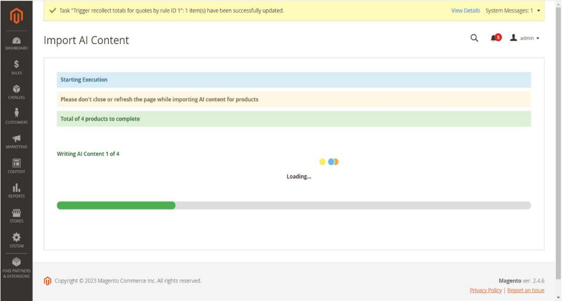 You can also mass-upload content at the same time. Go through, Catalog ->Product ->Actions ->Import AI Content