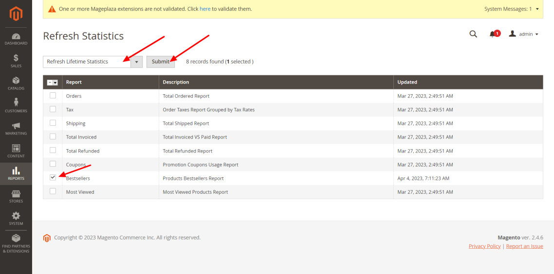 Using this extension, you can show bestseller products automatically by using the configuration “Show Bestseller products Automatically” to Yes. If you make this configuration to No, then you can add the products id in the “Enter Product ids” field. These given products will show as bestseller products. The first 5 products will show on the bestseller grid. You can also enable view all, then a button link will show at the bottom of the gird. On that page, will display the first 20 bestselling products. Please make sure that cron is working correctly on your store. The bestseller statistics are refreshing via cron on a daily basis. You can also refresh the statistics from admin panel. Go to Admin -> Reports -> Statistics -> Refresh Statistics then select the bestsellers and submit.