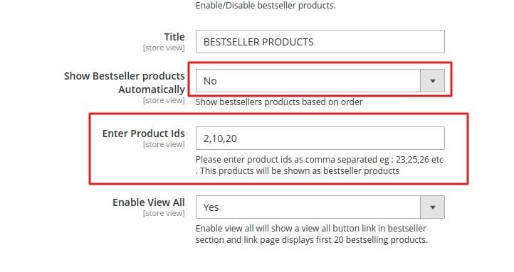 - Show Bestseller products Automatically – Enable this configuration to show bestseller products based on order. If you set this configuration to “No” then you can add products manually in “Enter Product Ids” configuration . Please see below screenshot.