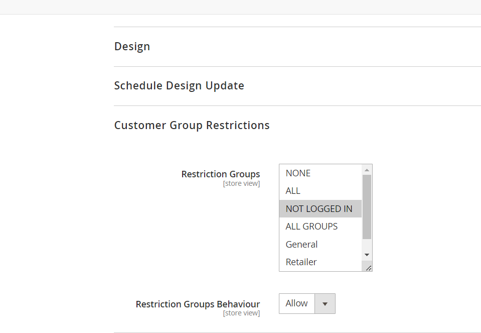 In this scenario, the category will be allowed only when the customer is not logged in and for all customers with other groups it will be redirected to login page or 404 (Page not Found) as configured in admin configuration (Restriction Behaviour in Figure 3).