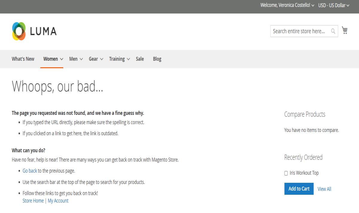 As mentioned above category Women is restricted for all other customer groups except Not Logged In and for that customer group the restriction behaviour is configured as Not found page. So, when a customer with any other customer group tries to access the category it will redirect to 404 (Page not Found) based on the configured restriction behaviour.
