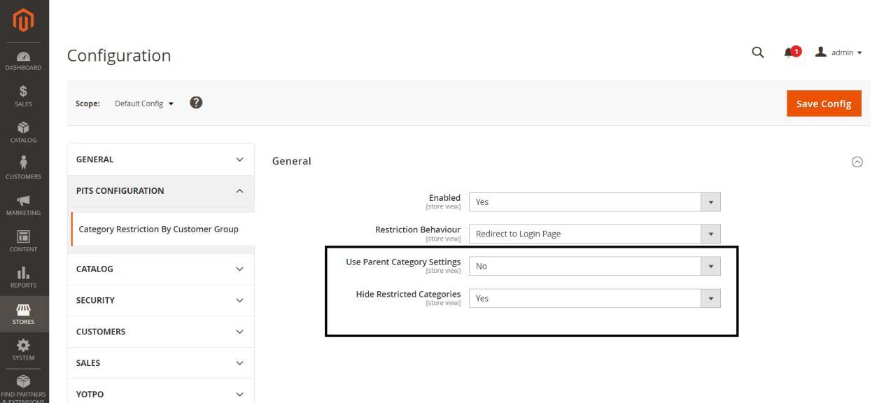 Navigate to Admin -> Stores -> Configuration -> Pits Configuration -> Category Restriction by Customer Group