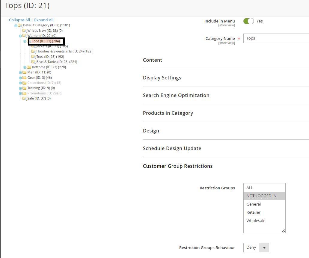 - Go to Catalog -> Categories -> Select a necessary category -> Select the section “Customer Group Restrictions”.