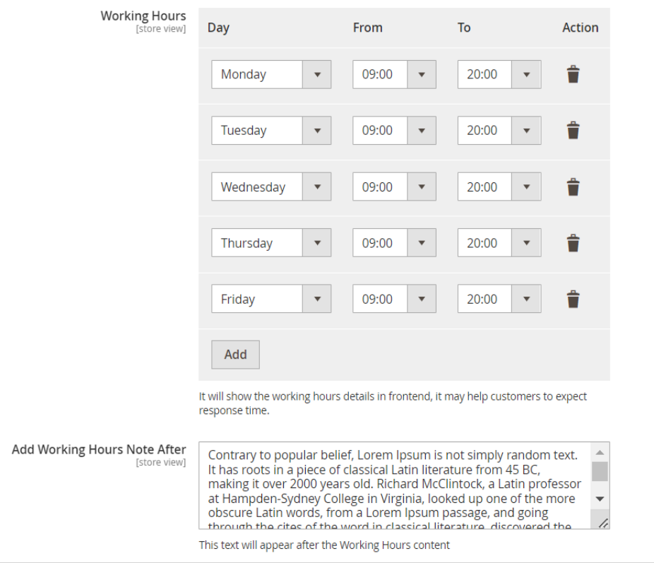 In addition to the ticket management and customer support features, the Help Desk Extension for Magento 2 offers a streamlined working hours setup. This functionality allows administrators to define specific working hours for their customer support team, which are prominently displayed to customers, through the front-end interface. Clients can easily identify the operational hours during which they can expect prompt responses and assistance. This transparent approach not only manages customer expectations effectively but also ensures that inquiries submitted outside these hours are noted, setting the stage for timely resolutions once the support team is back online. This feature enhances transparency and customer satisfaction by providing clear visibility into the support team's availability.