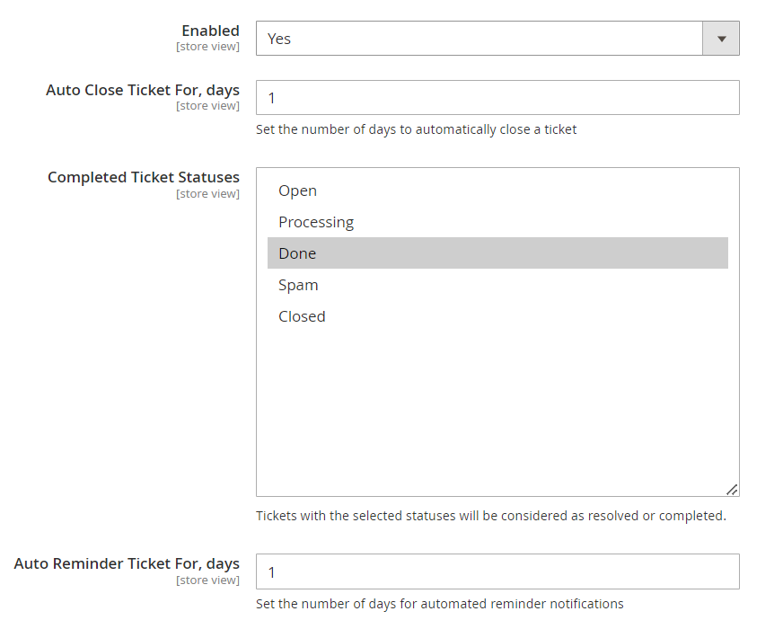 - This automated process relies on specific parameters configured in the system, "Auto Close Ticket For, days" and "Auto Reminder Ticket For, days."