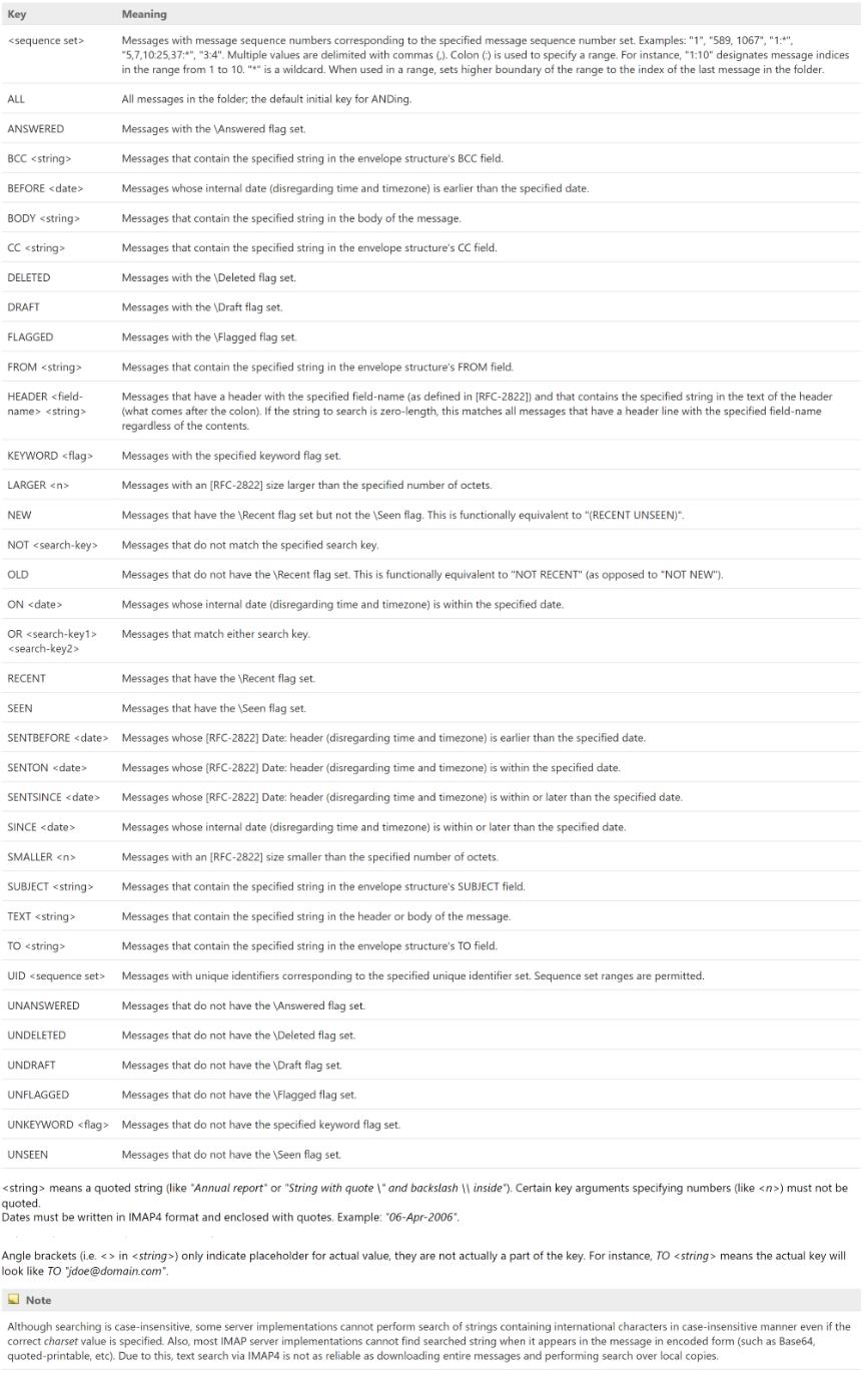 - Search Keyword: Term used to locate specific content within the gateway. We are using IMAP to get emails. This protocol provides a feature to search. We can create search keywords with the help of documentation - reference