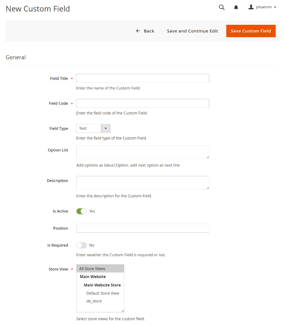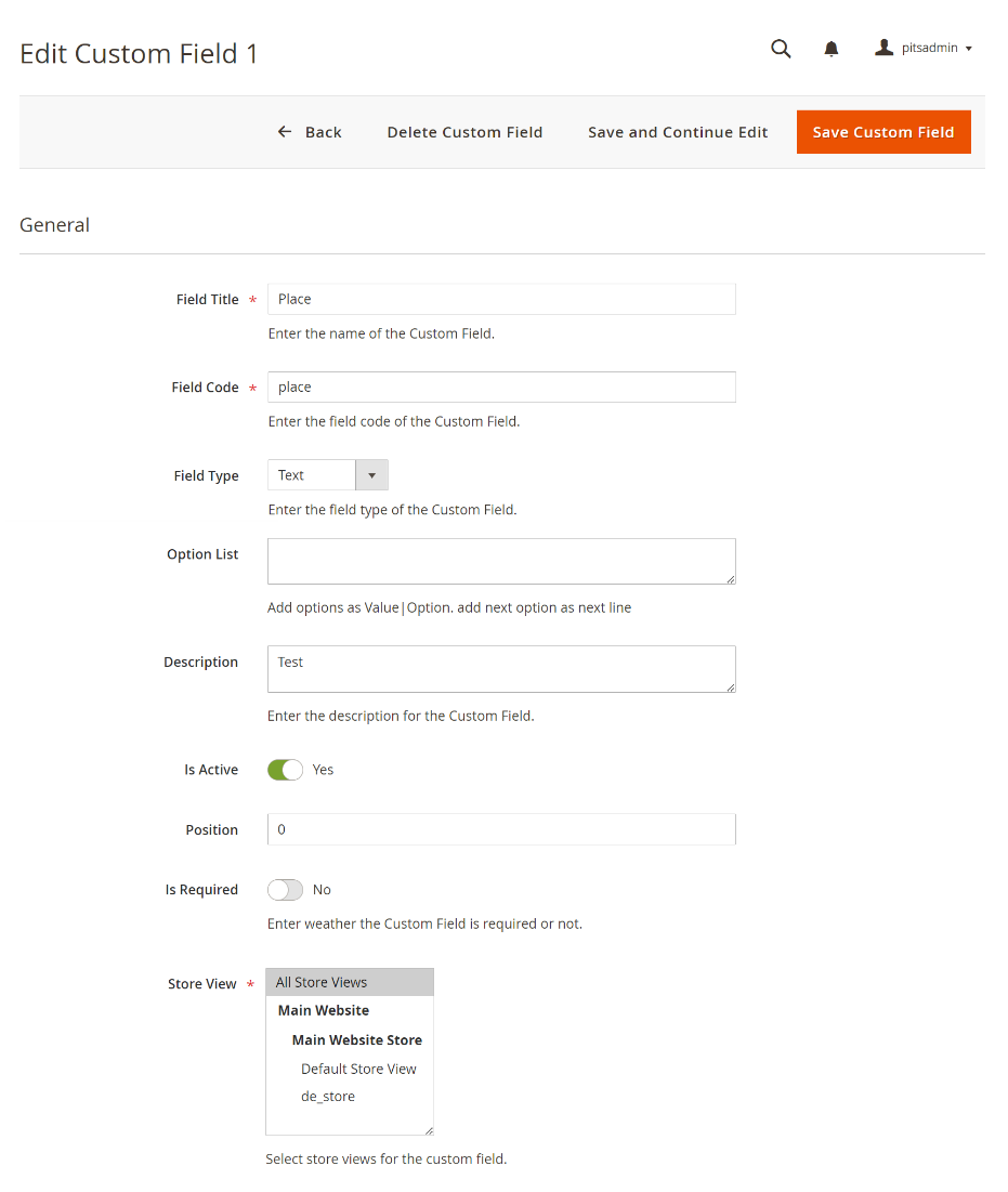 - Store View: Option to choose stores in which the custom fields are displayed.