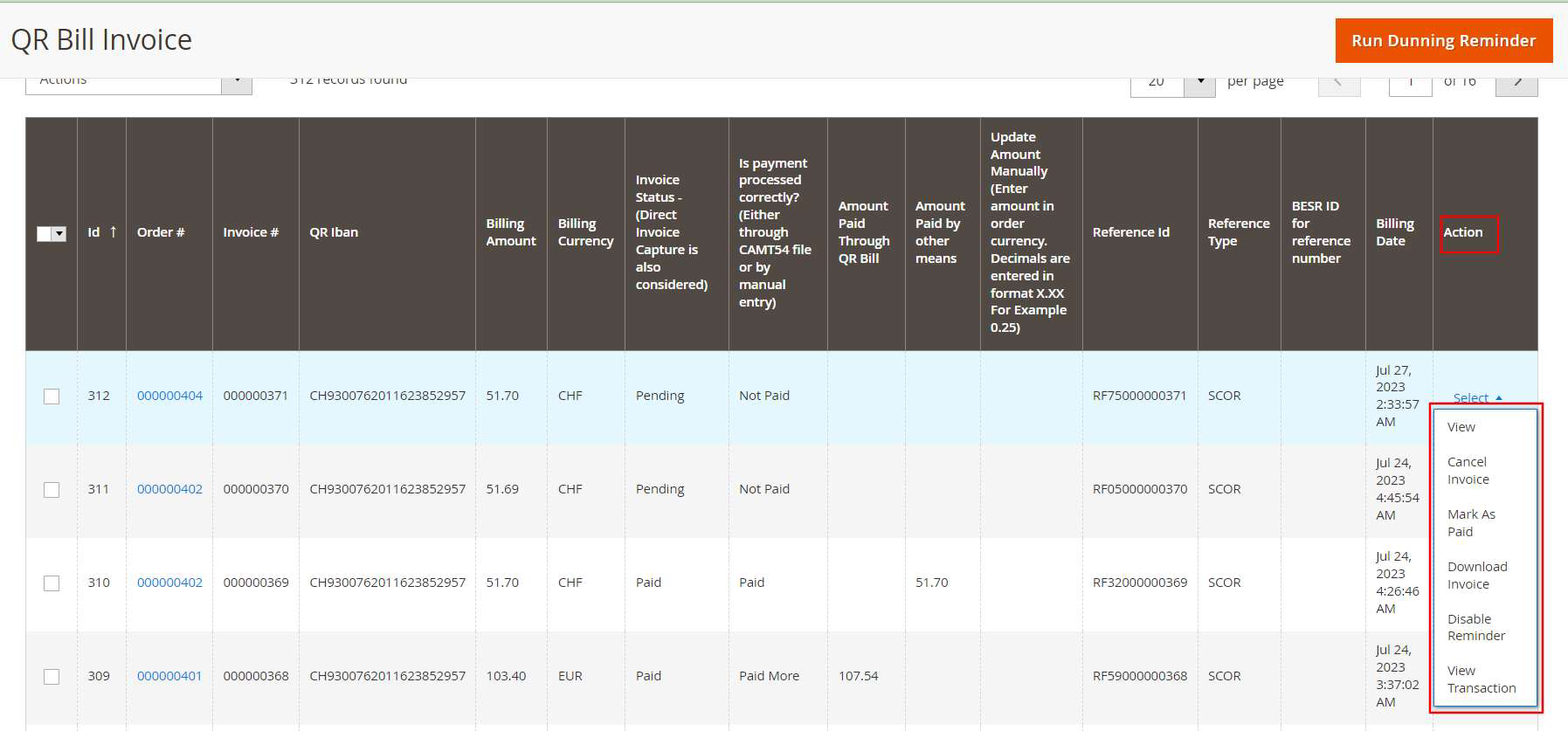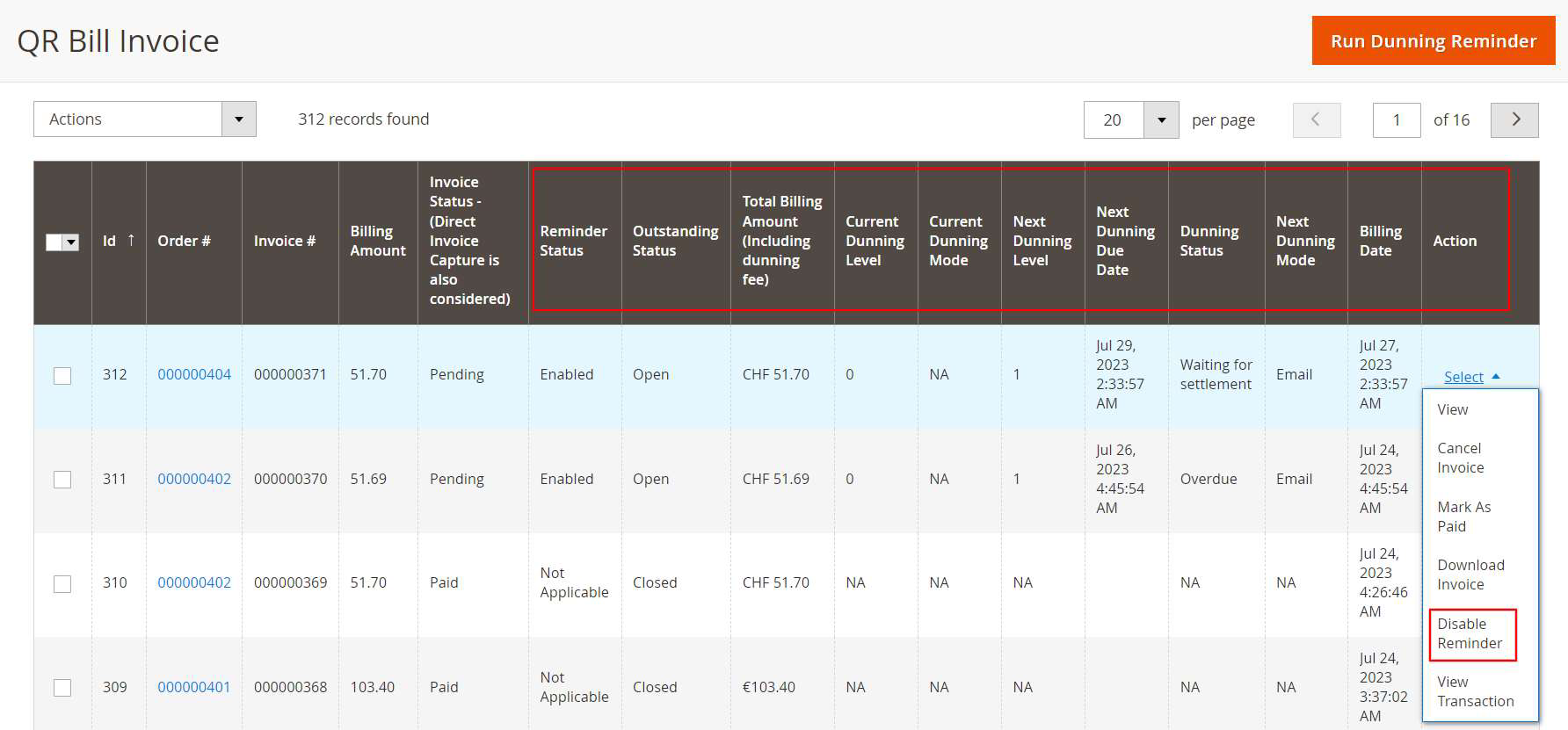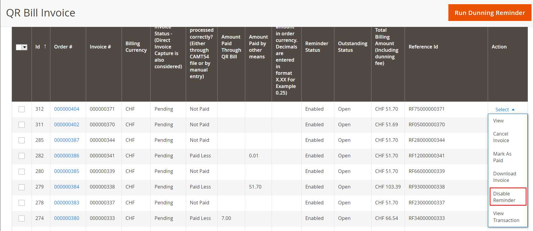 - Action - Merchant can view dunning details, download the dunning pdf, send reminder email and disable/enable dunning for invoice from this grid.