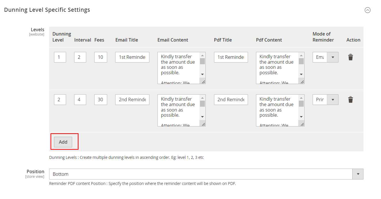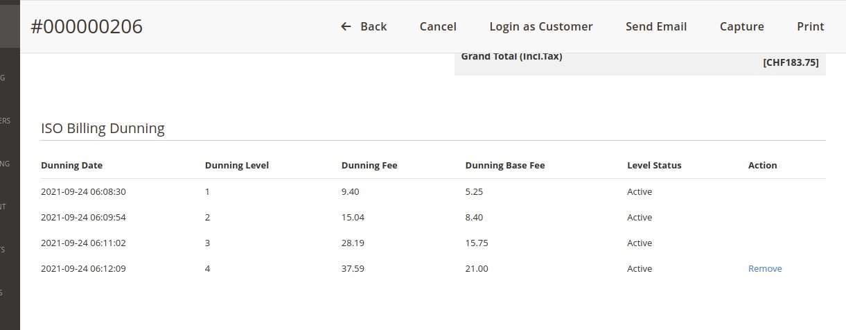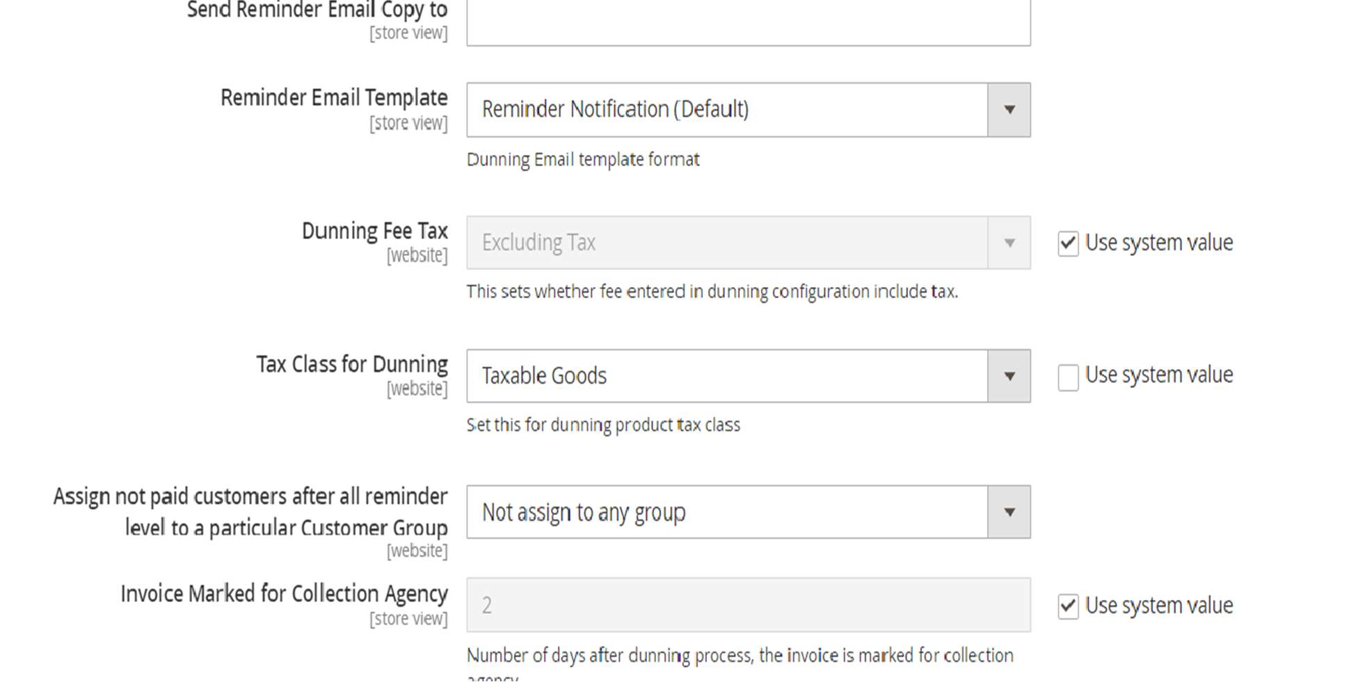 - Dunning Base Fee - The dunning fee added to invoice in base currency of the shop