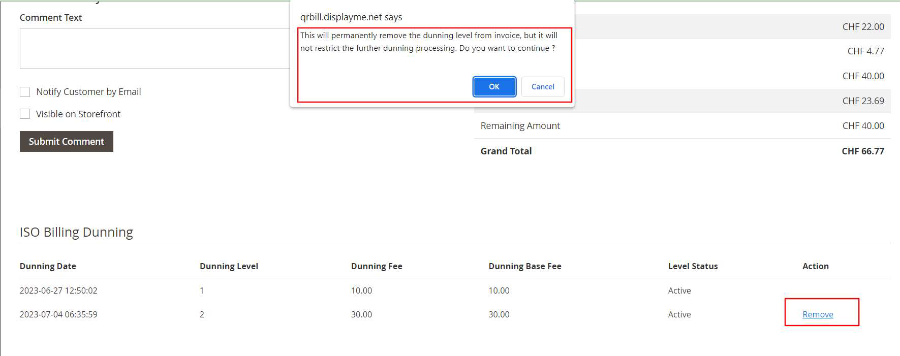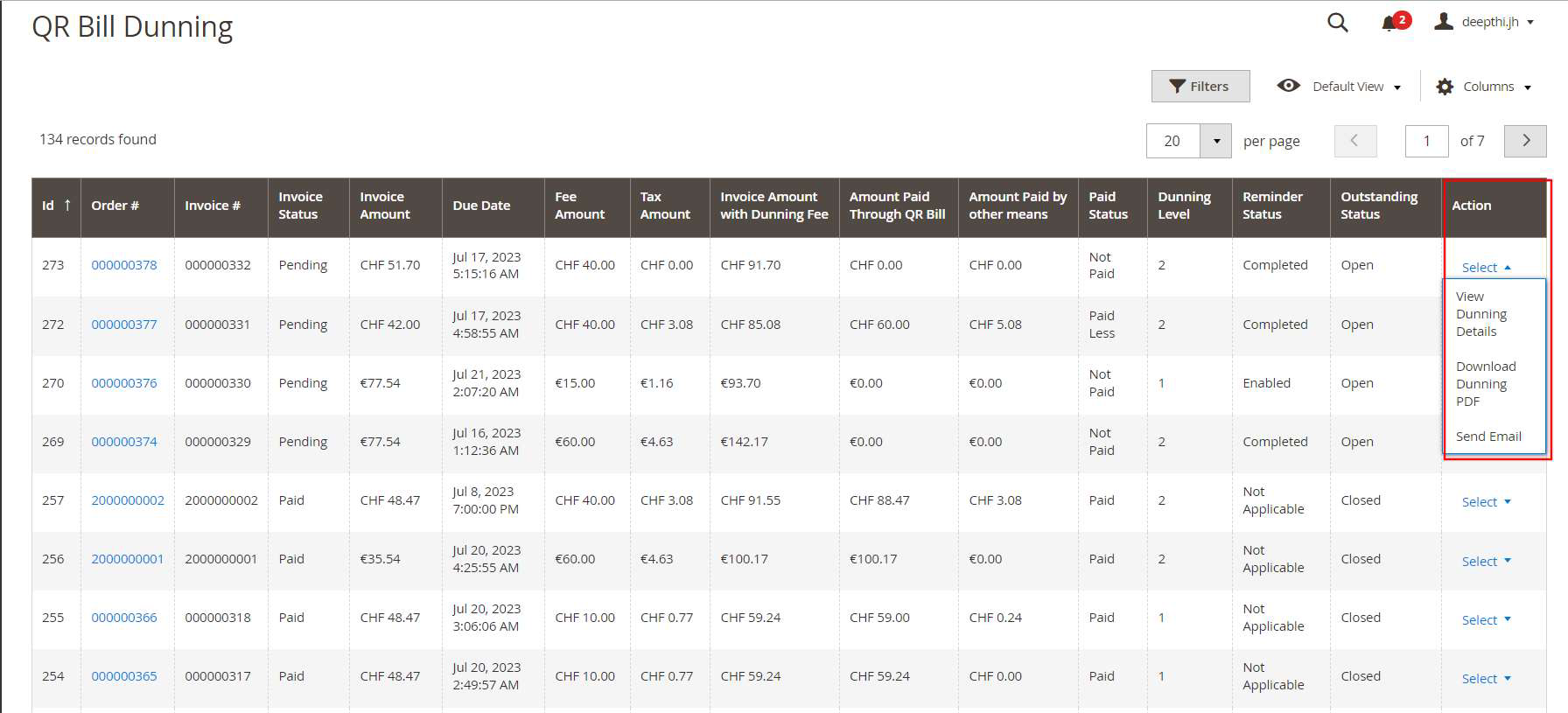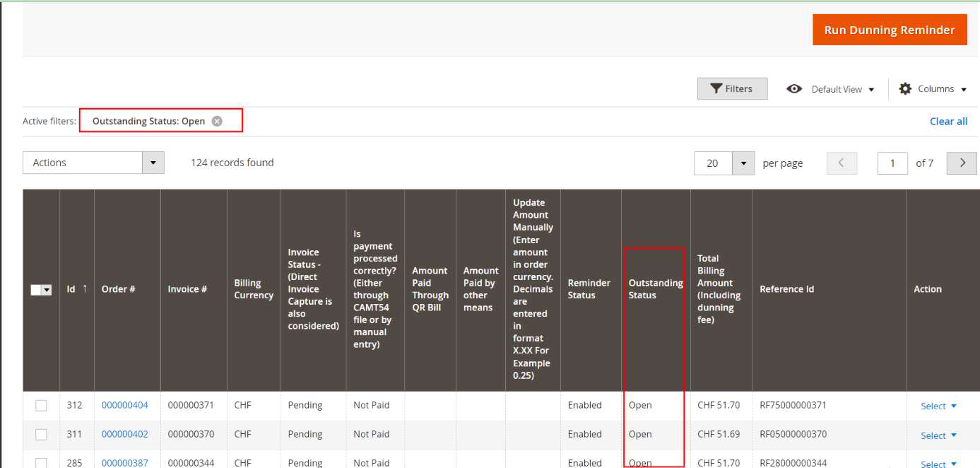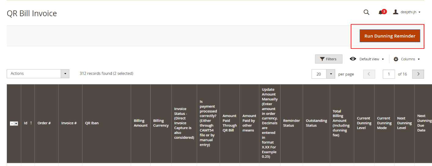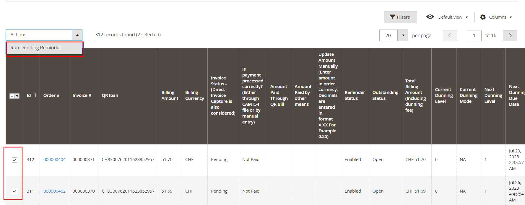 Dunning grid provides details about dunning process, amount and current processing status. Grid can be accessed via Sales → QR Bill Invoice -> Dunning Grid. (Refer Figure 23)