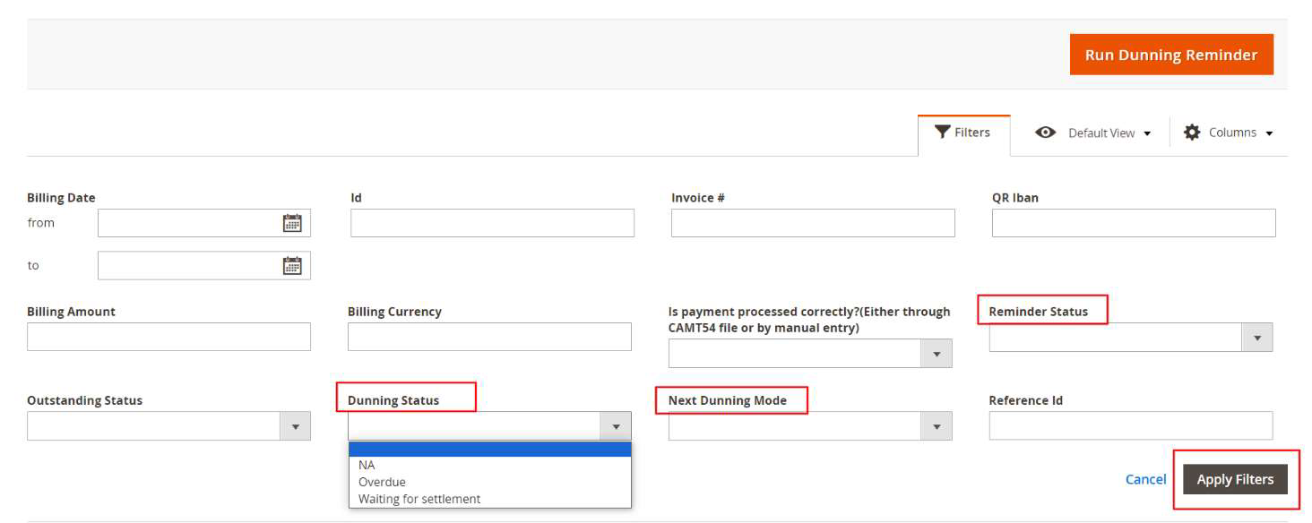 - Next Dunning Mode: This filter list the next dunning mode. It can be either email or print