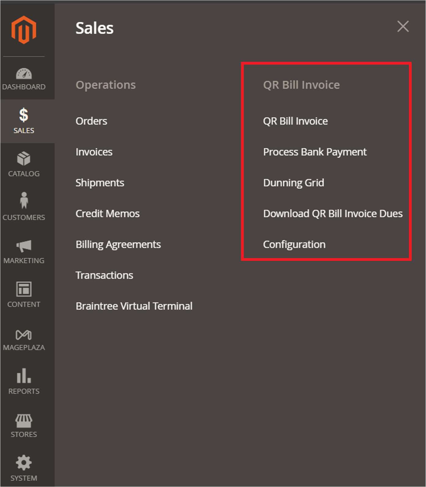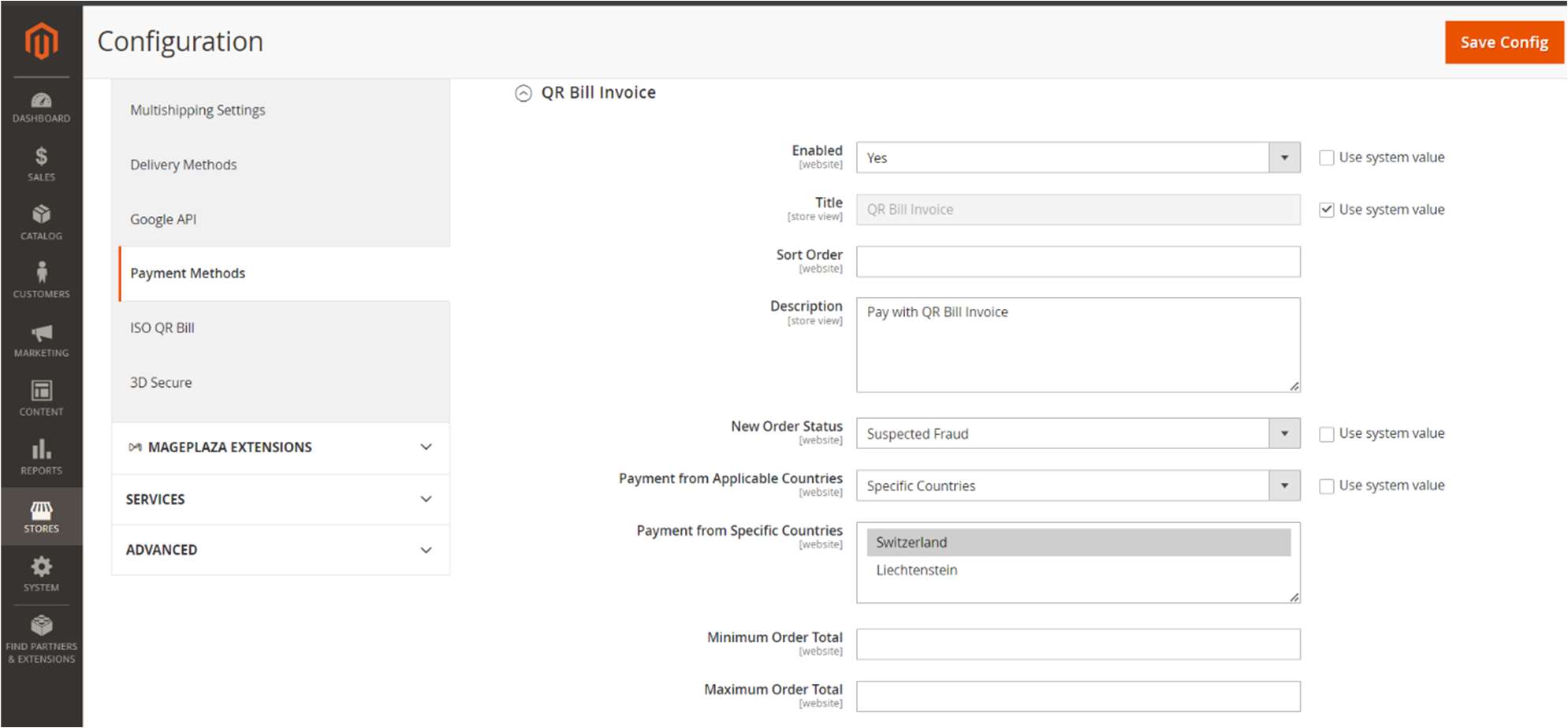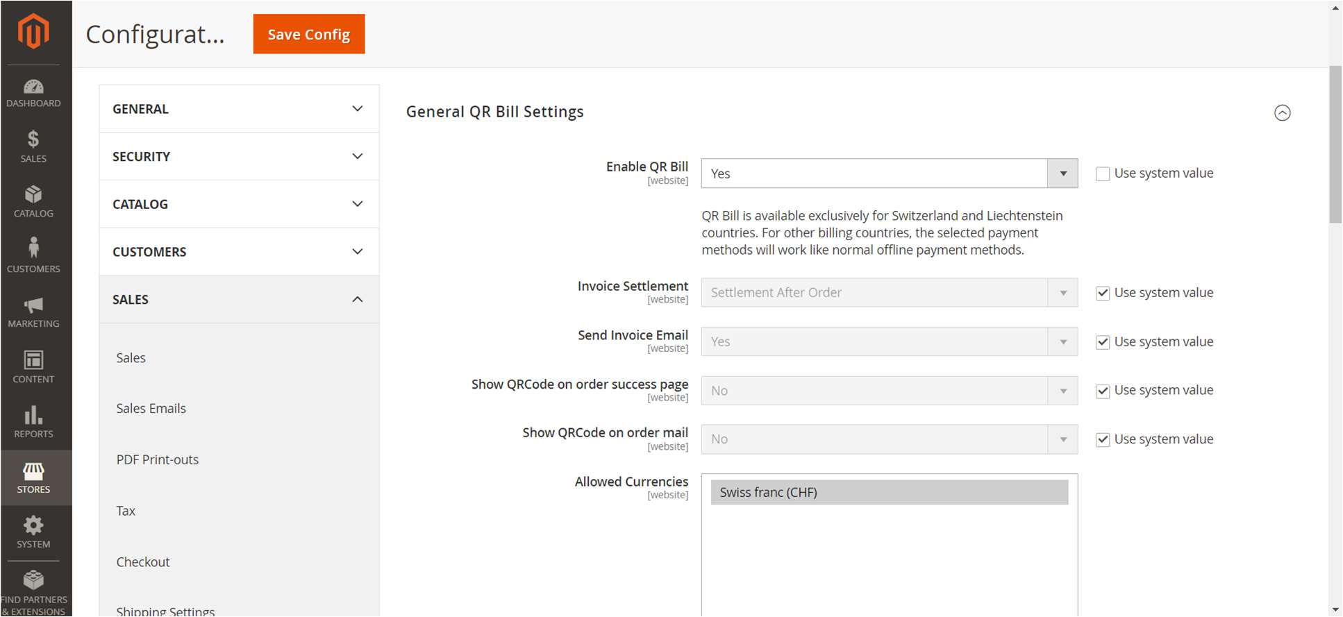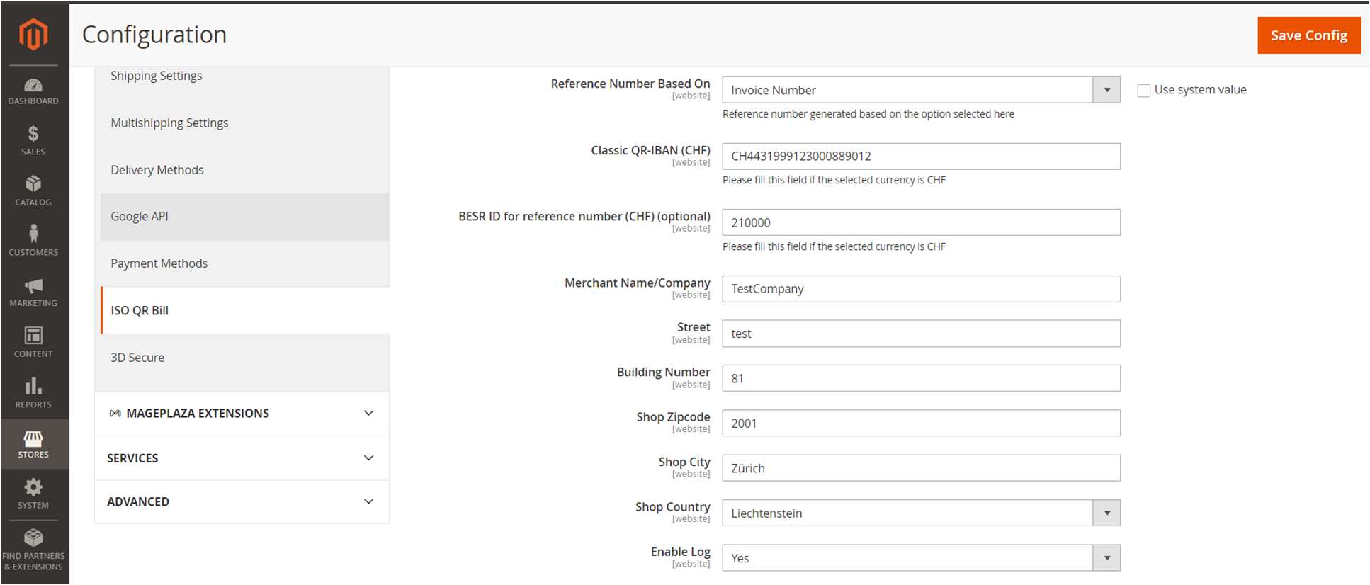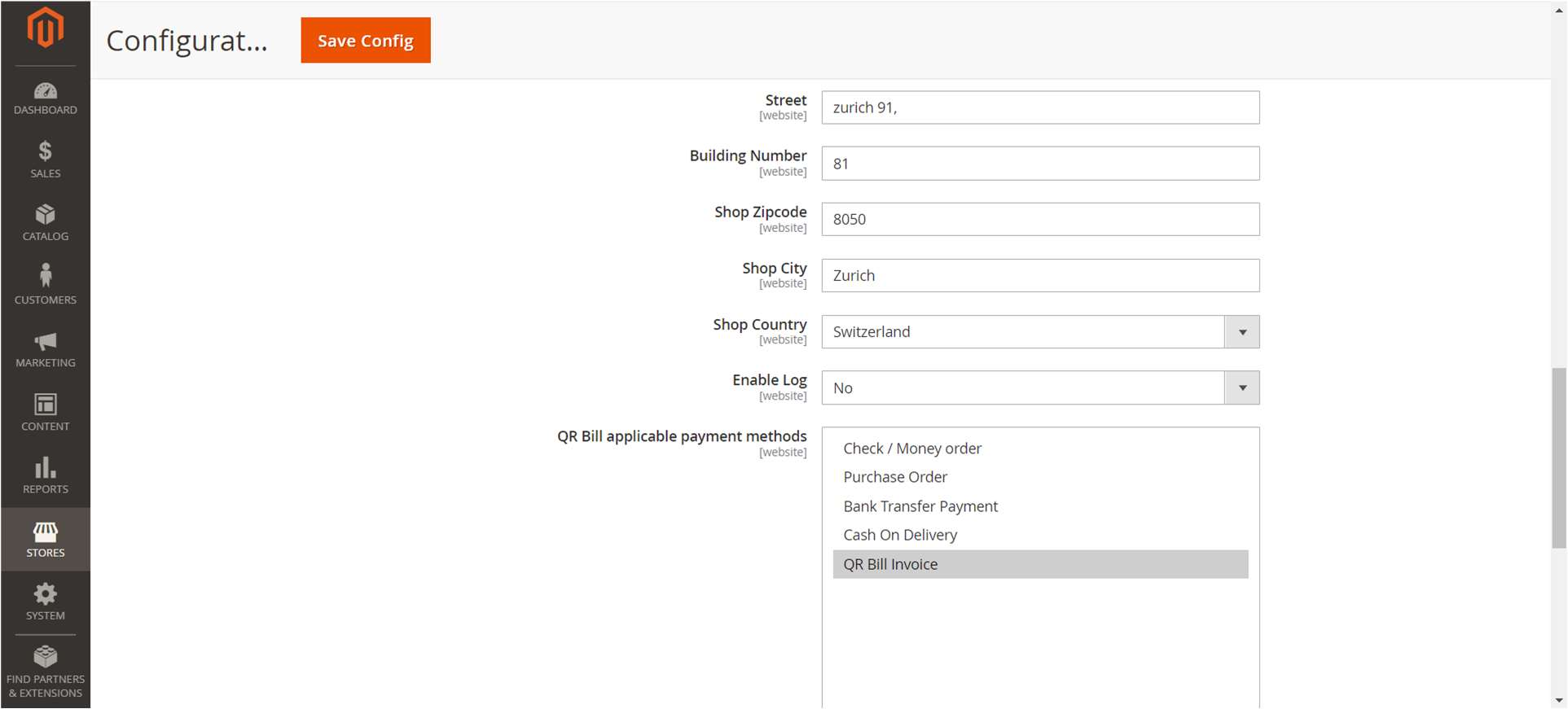 Log in to the admin panel and navigate to Stores → Configuration → Sales → ISO QR Bill → General QR Bill Settings or Log in to the admin panel and navigate to Sales → QR Bill Invoice → Configuration.
