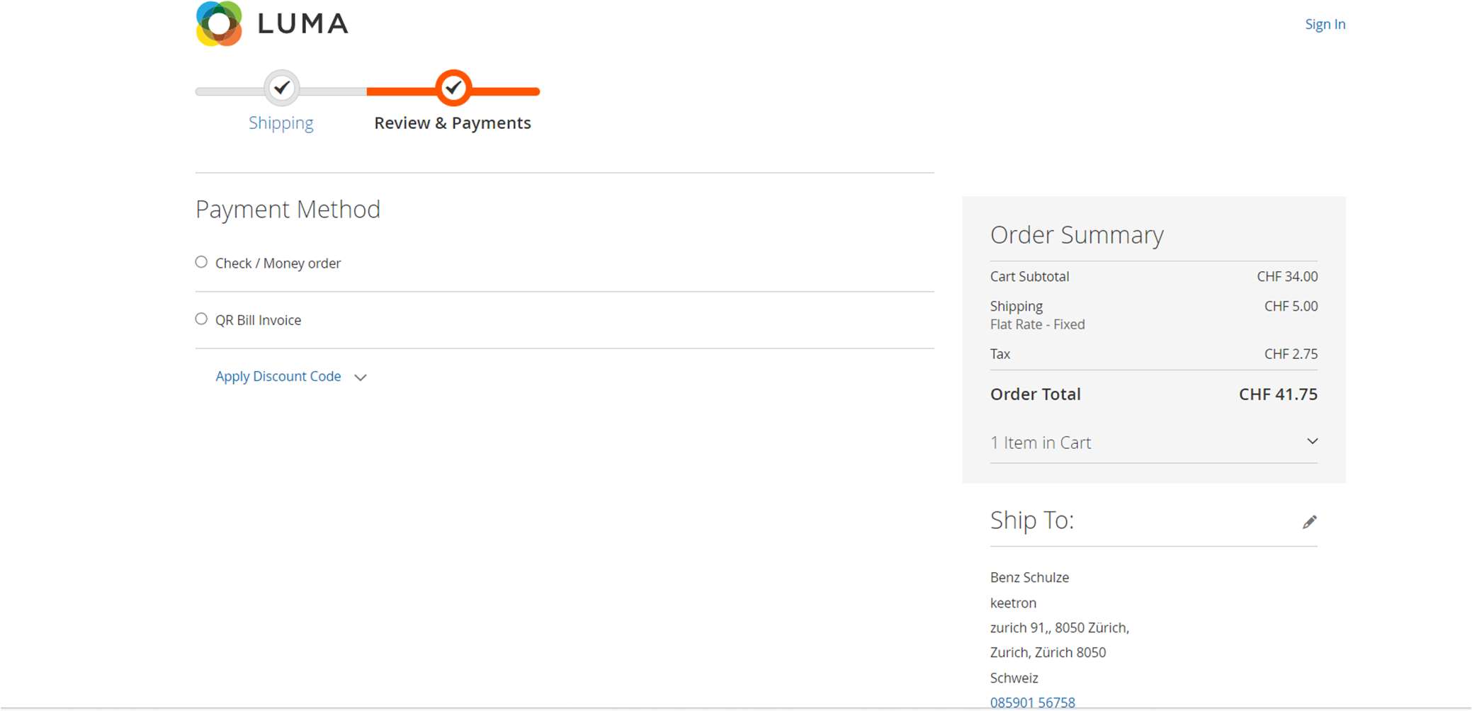 In this section, we discuss how to place an order with QR Bill feature enabled payment method. While placing an order, ensure that you select a country compatible with QR Bill (Switzerland or Liechtenstein) and use the allowed currency (CHF) specified in the General QR Bill settings. If the currency and country are compatible with QR Bill, you can select a QR Bill invoice supported payment method and place the order.