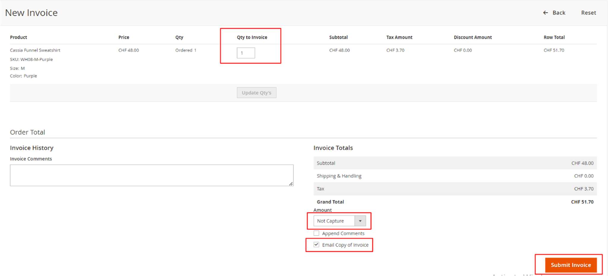 - If you have selected “Settlement after order” as the “Invoice Settlement” settings value then, the invoice is created automatically after placing the order, and the customer will get an invoice email attached with the invoice pdf. If the “No invoice settlement” option is selected, then no invoice is created while placing order and the admin must create the invoice manually from backend. While creating invoice manually, make sure that invoice is created with “Not capture” option in Amount dropdown, otherwise the invoice become paid and further processing of payment and dunning will not work as expected.