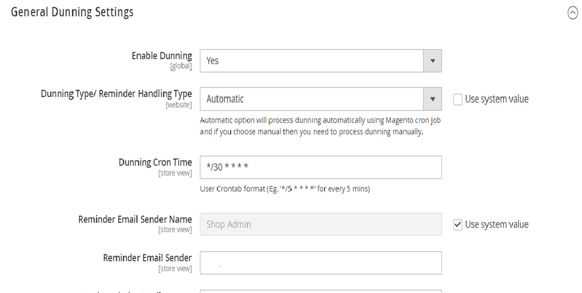 - Disabled for Customer: Dunning process is disabled for that particular customer. See section: Exclude Customer From Dunning.