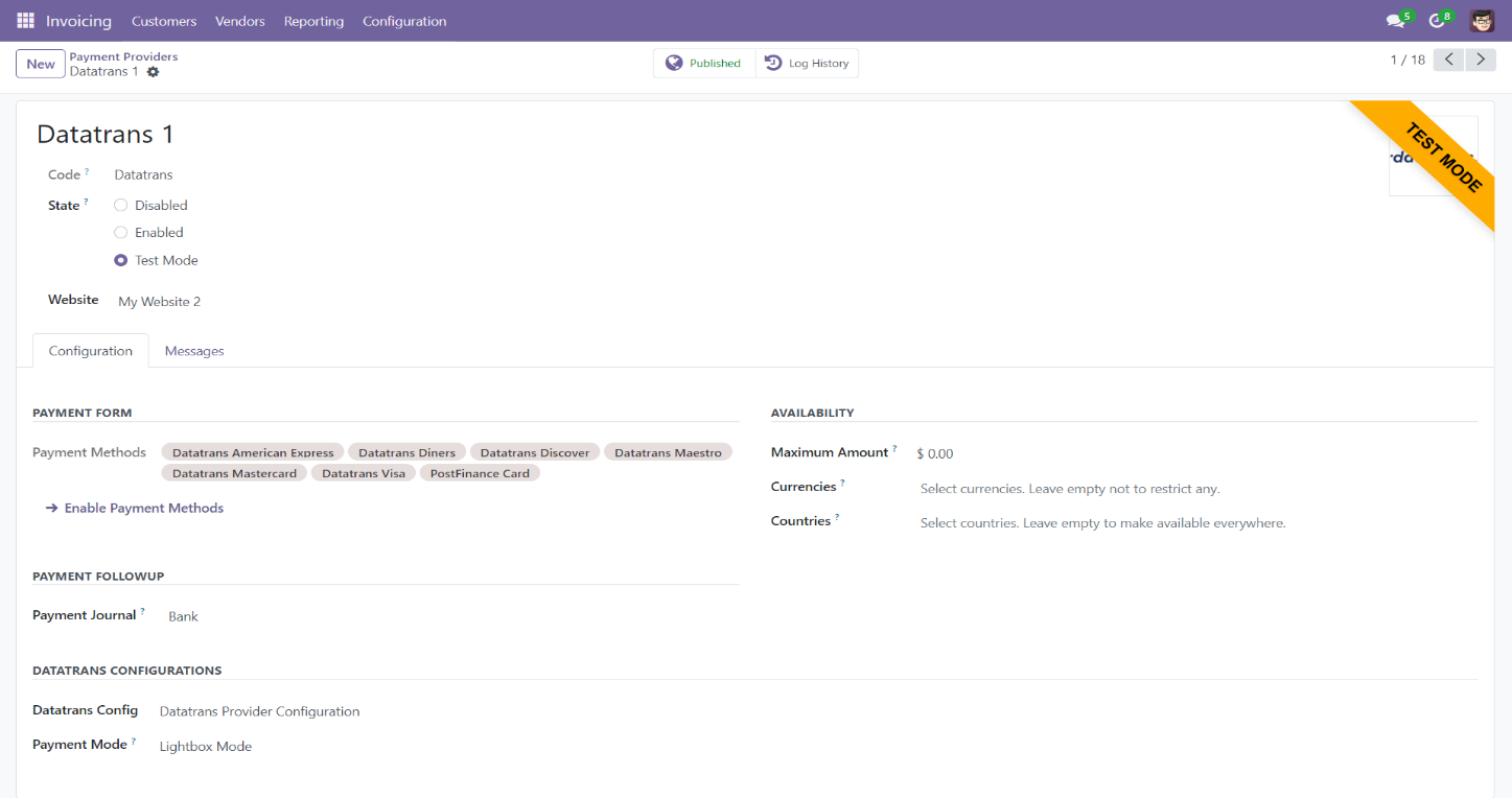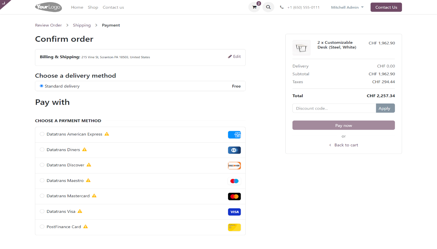 Das "Datatrans Payment Acquirer Plugin" ist einfach zusäinstallieren und fügt sich als zustzliches Zahlungsmodul nahtlos in den odoo Webshop ein. Datatrans ist der führende Schweizer Zahlungsanbieter, der eine breite Palette von Zahlungsmethoden unter Kartenzahlung, digitale Geldbörsen und andere alternative Zahlungsmethoden unterstützt. Dieses Plugin arbeitet im Redirect-Modus, d.h. der Kunde wird auf die Datatrans-Zahlungsseite weitergeleitet, die mit nur einer einzigen Integration Zugang zu allen vom konfigurierten Händler unterstützten Zahlungsmethoden bietet. Der Vorteil ist, dass schnelle, sichere und einfache Zahlungen letztendlich zu höheren Umsätzen führen.