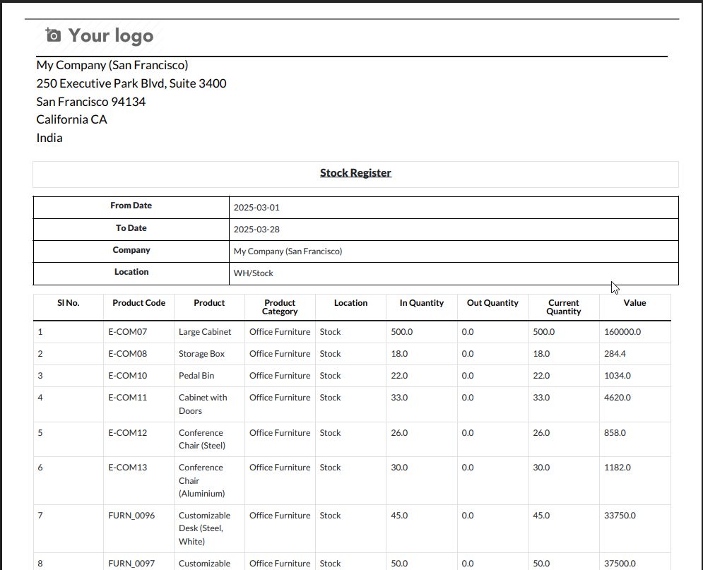 The Inventory Reports module provides comprehensive insights into inventory management, helping businesses track stock levels, movements, and valuations. By extending Odoo's native inventory features, this module offers customizable reports that can be downloaded in PDF or Excel formats. These reports assist in inventory planning, cost analysis, and supply chain optimization.