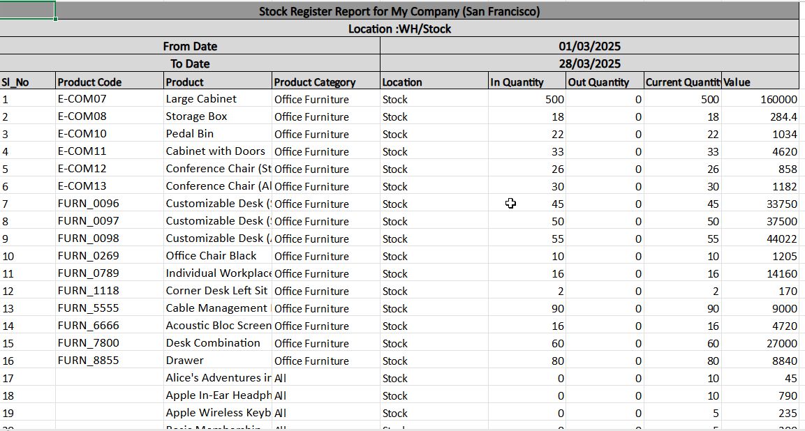 Screenshot 8: Sample Exported Excel – Stock Register Report