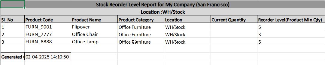 Screenshot 12: Sample Exported Excel – Stock Reorder Level Report