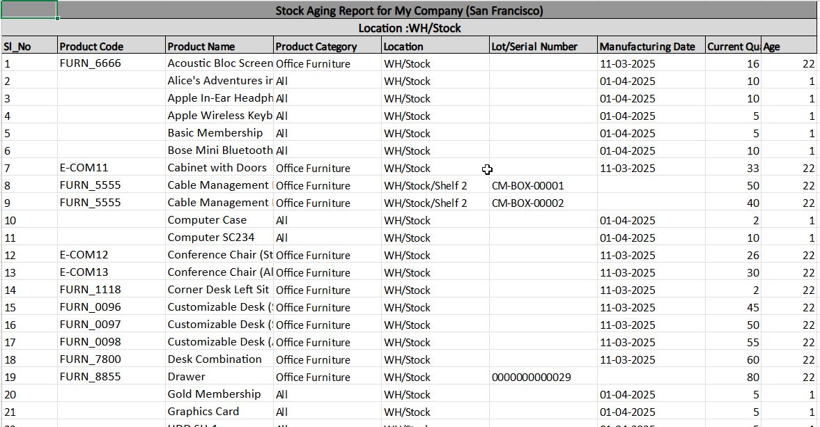 Screenshot 16: Sample Exported Excel – Stock Aging Report