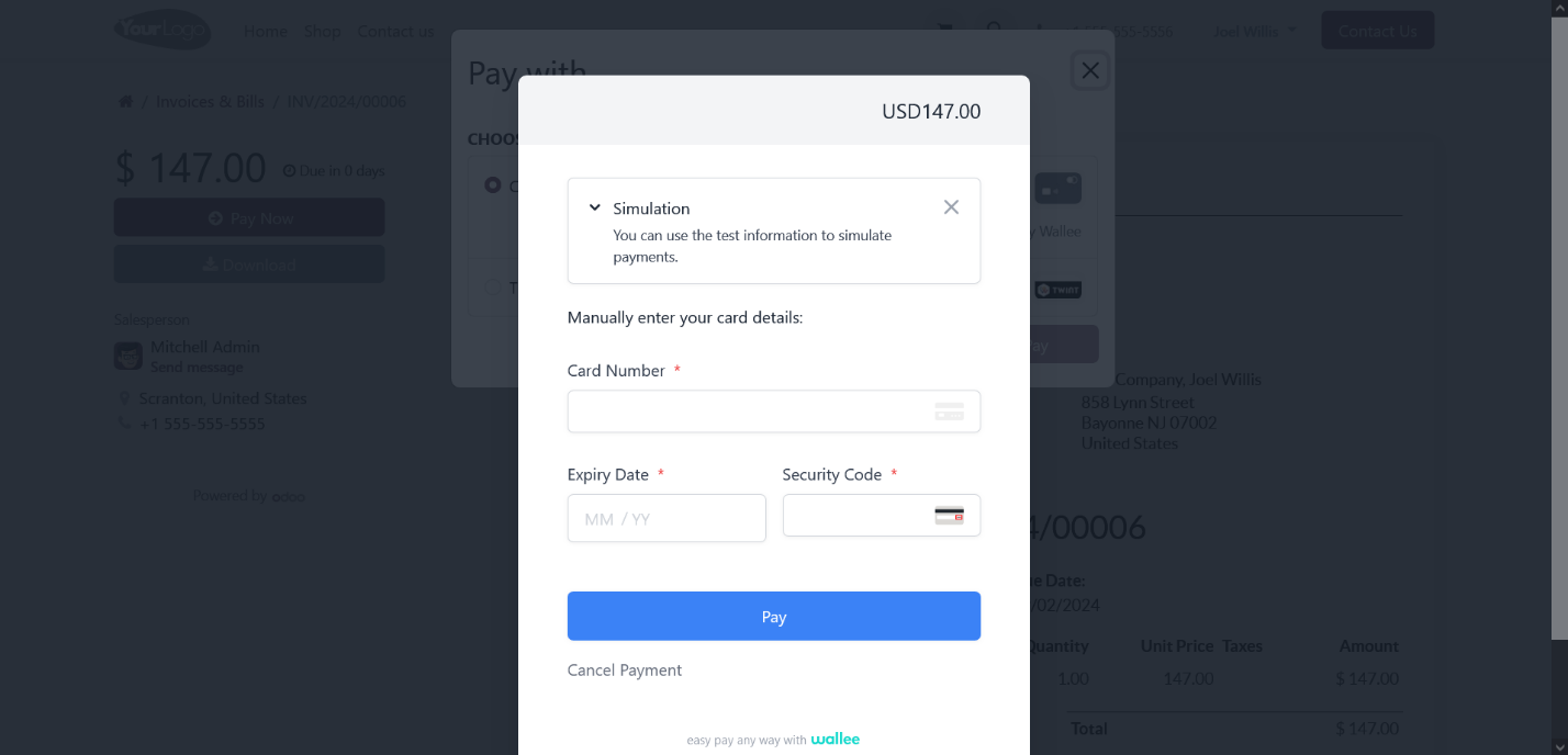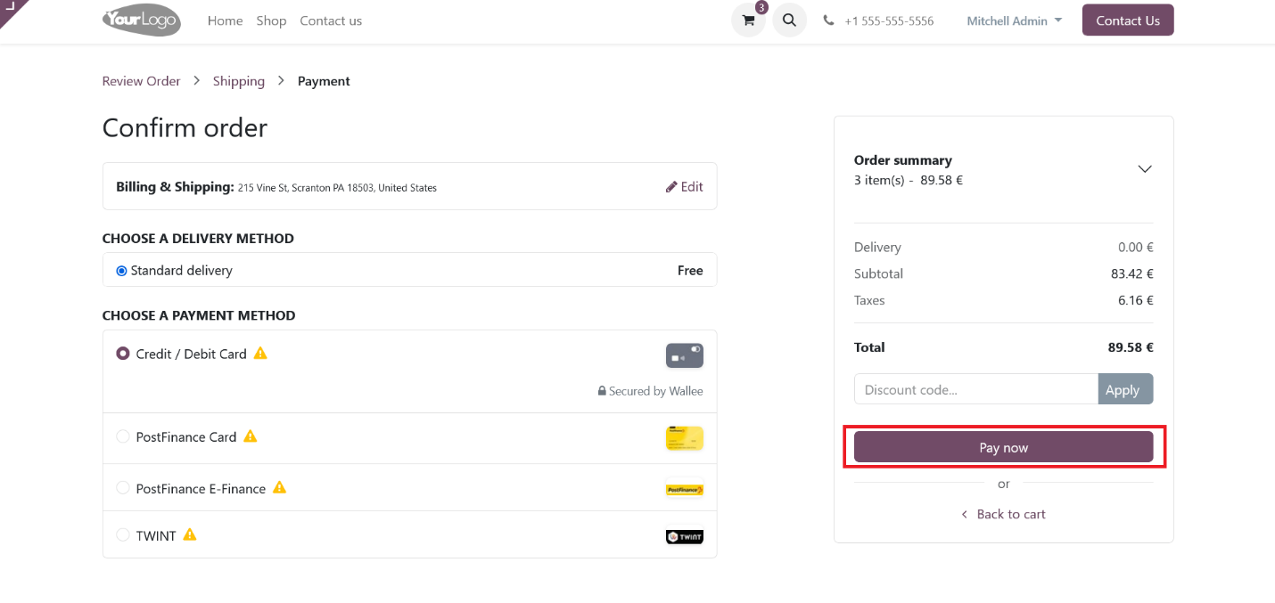 Choose your preferred payment method from those listed on the payment screen based on your currency. Then, click the 'Pay Now' button on the Odoo eCommerce payment screen to proceed to the Wallee payment interface and complete your payment.