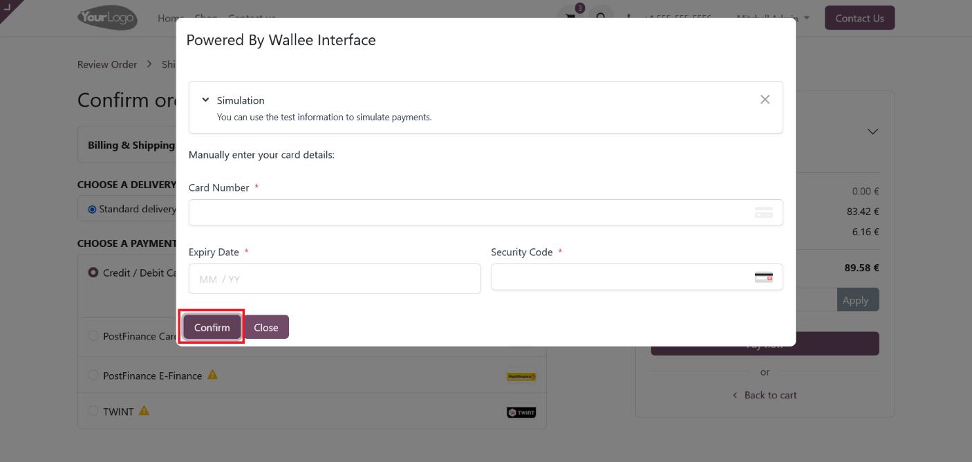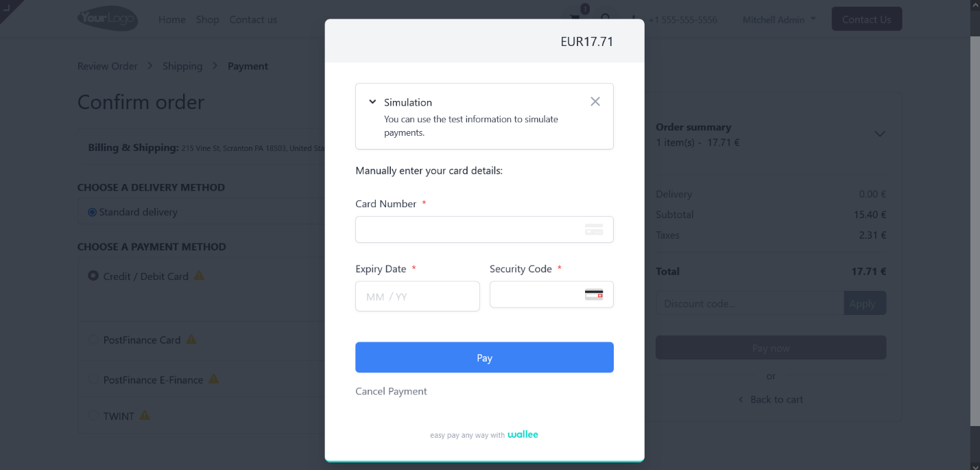 Select your preferred payment method to proceed with the payment, and then click the ‘Pay’ button to access the Wallee provider interface.