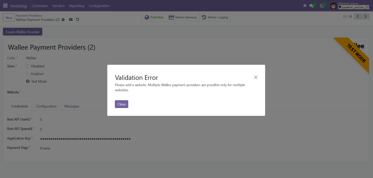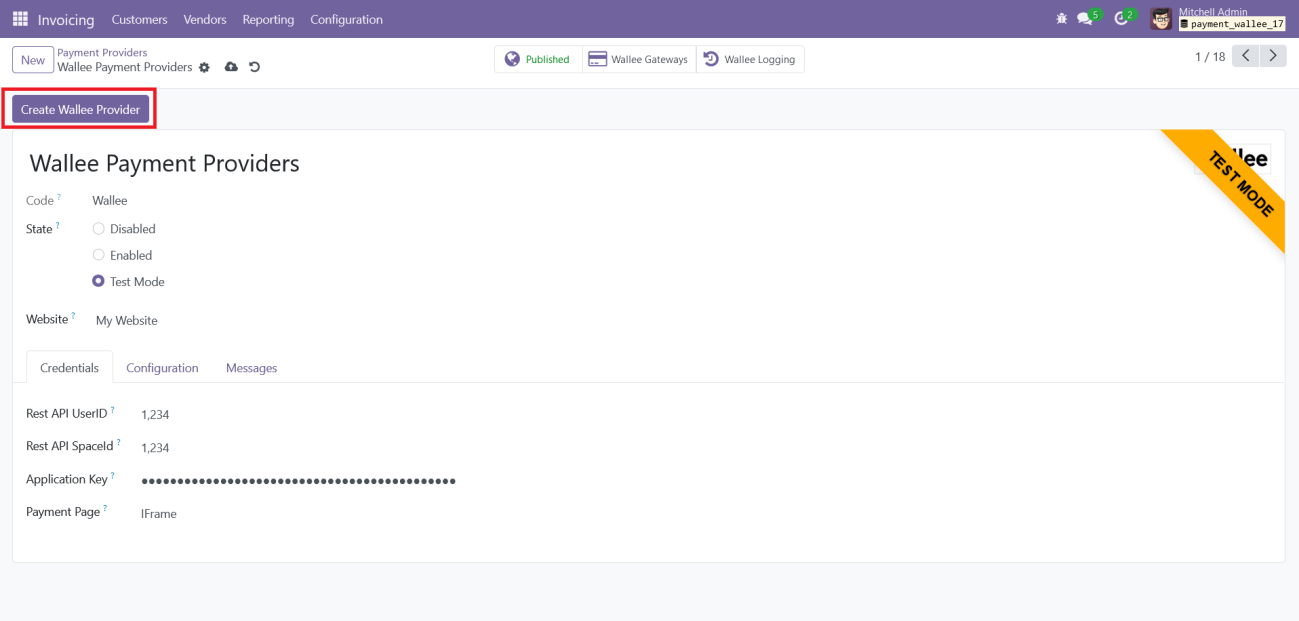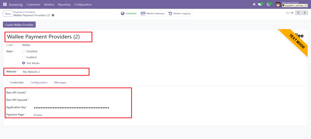 Clicking the “Create Wallee Provider” button will create a new Wallee Provider in Odoo with a unique name. Next, you’ll need to associate this provider with the desired website and input the credentials for the Wallee space that isn’t already configured in Odoo.