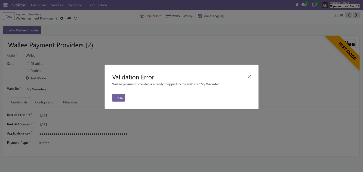 Screenshot 14: Message Displayed the Website is already Mapped to a Wallee Provider.