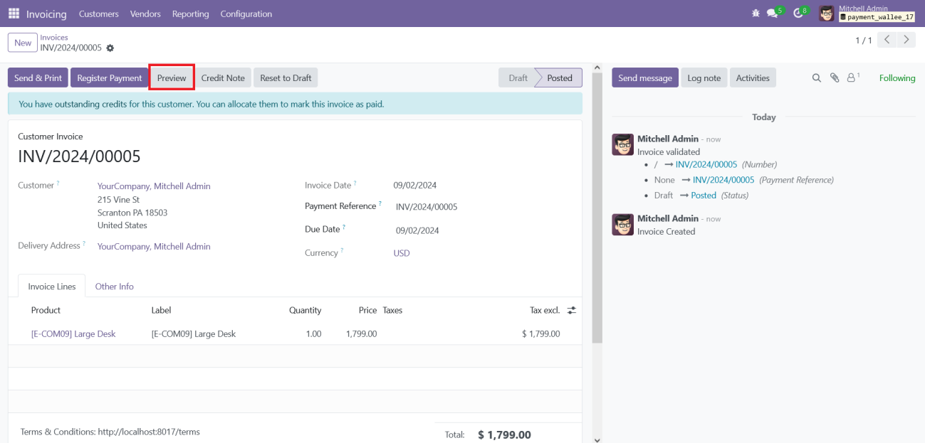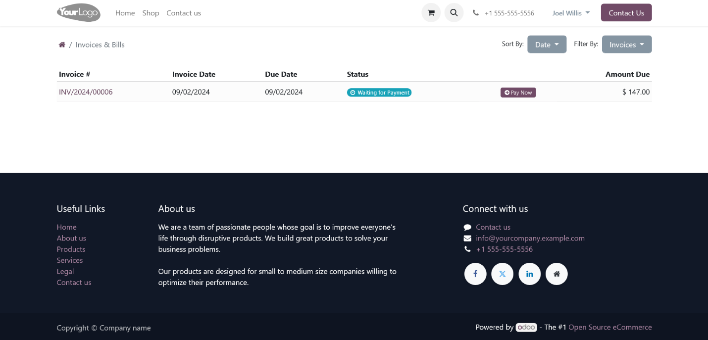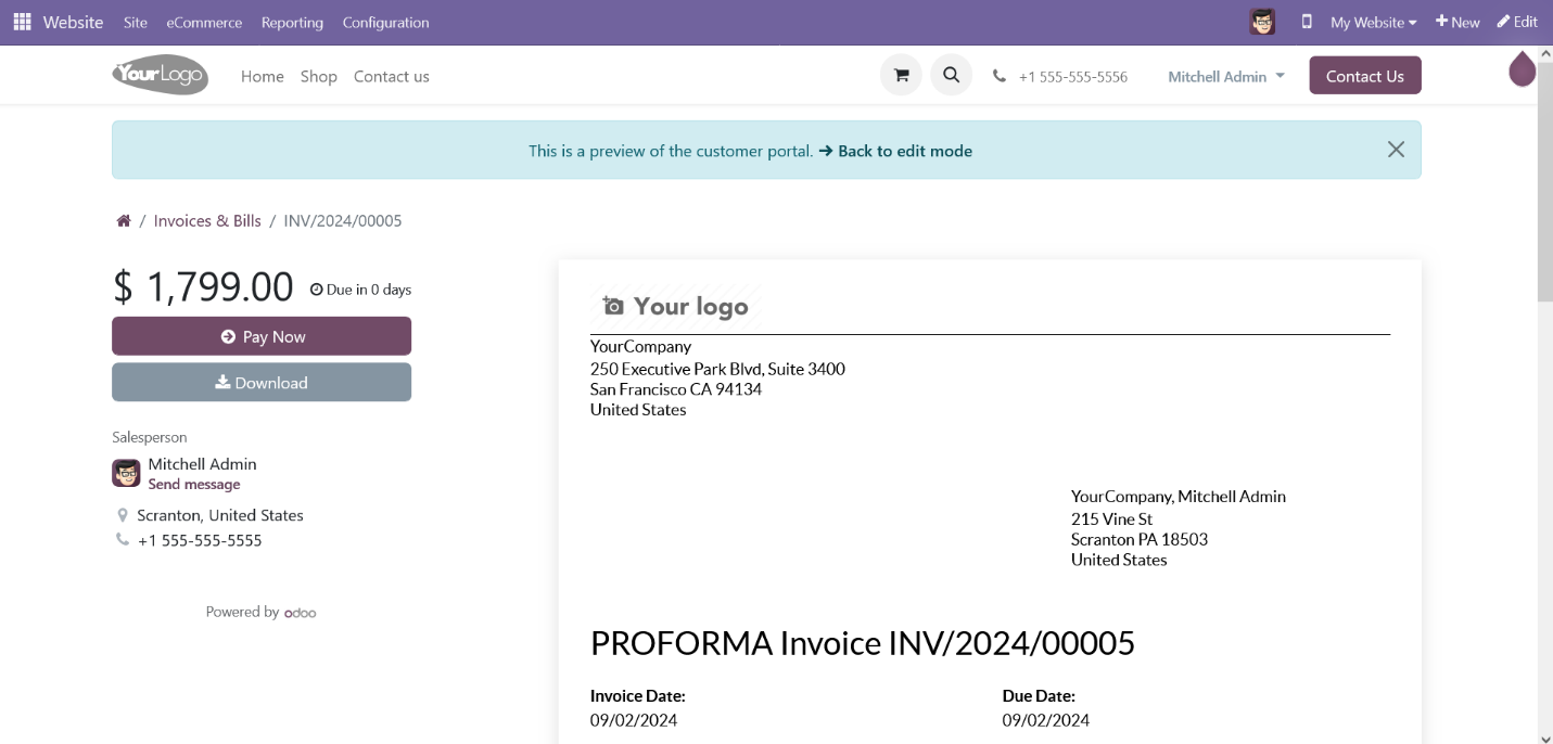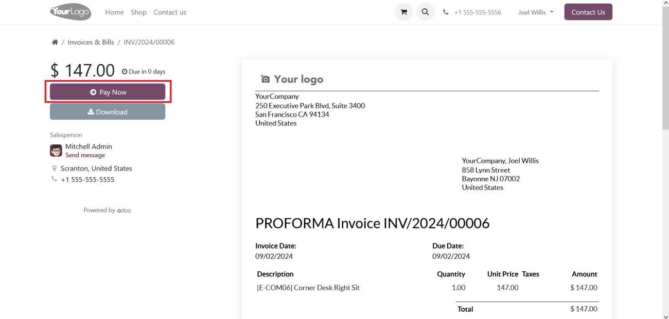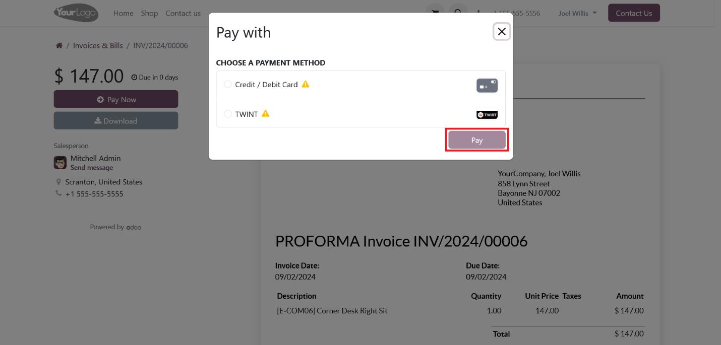 Once you generate and confirm an invoice in the Odoo backend, a ‘Preview’ button will appear. Clicking this button will redirect you to the portal page, where you will find a ‘Pay Now’ button. Clicking the ‘Pay Now’ button will open the payment interface as explained earlier.