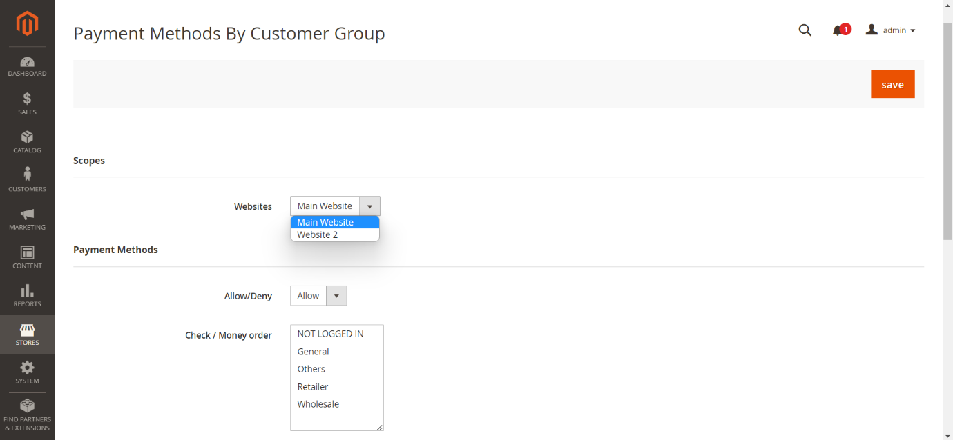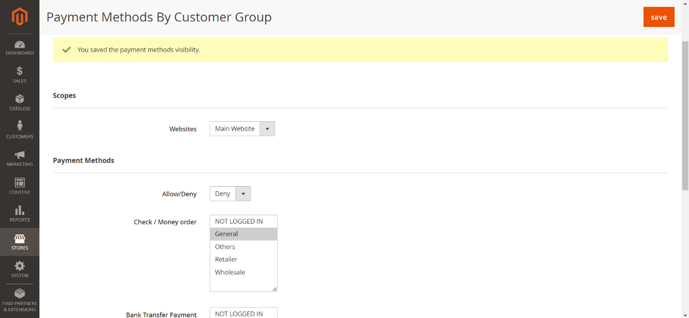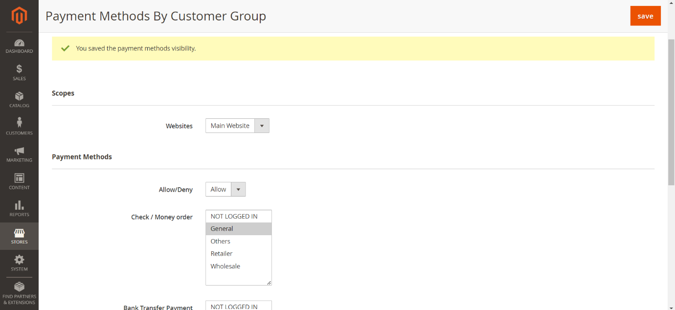 Please note that “Allow/Deny” drop-down is selected with “Allow”. Select a customer group to allow that customer group the selected payment method. Here we selected Check / Money order for General customer group and saved it.