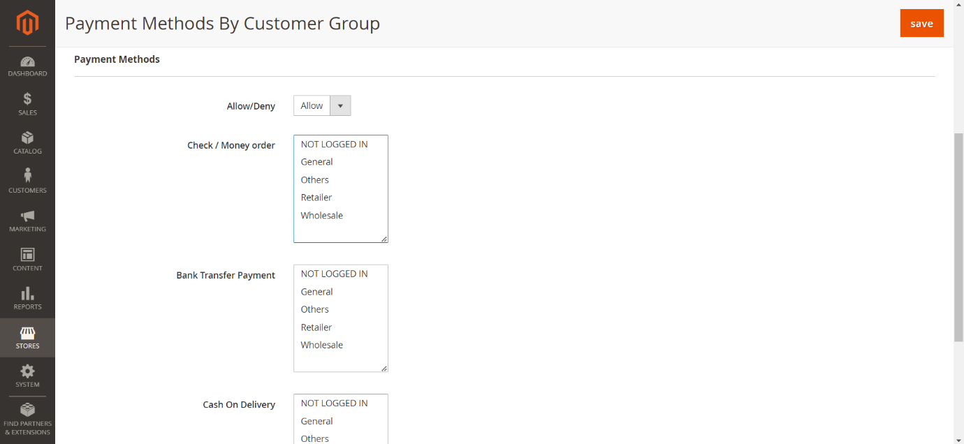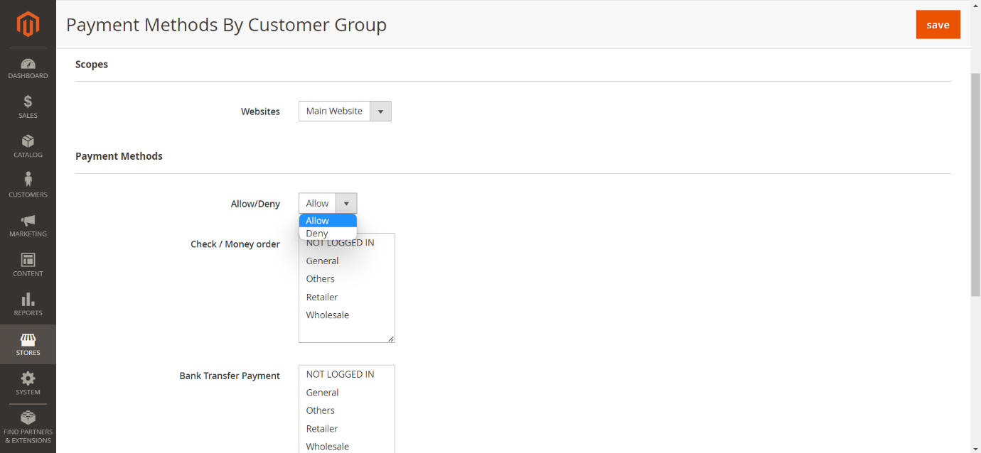 The dropdown “Allow/Deny” provides the option to Allow or Deny each payment method for customer groups.