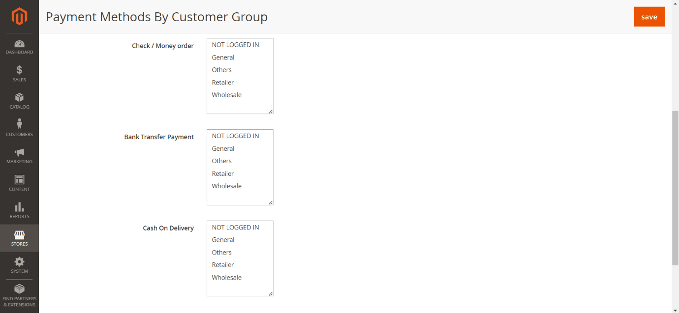 NOTE:Only enabled payment methods in the backend section Stores > Configuration > Sales > Payment Methods will be shown in the "Payment method by customer Group" configuration list.