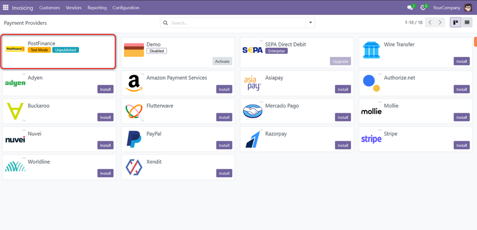 - Go to Invoicing module -> Configuration -> Select Payment Providers.