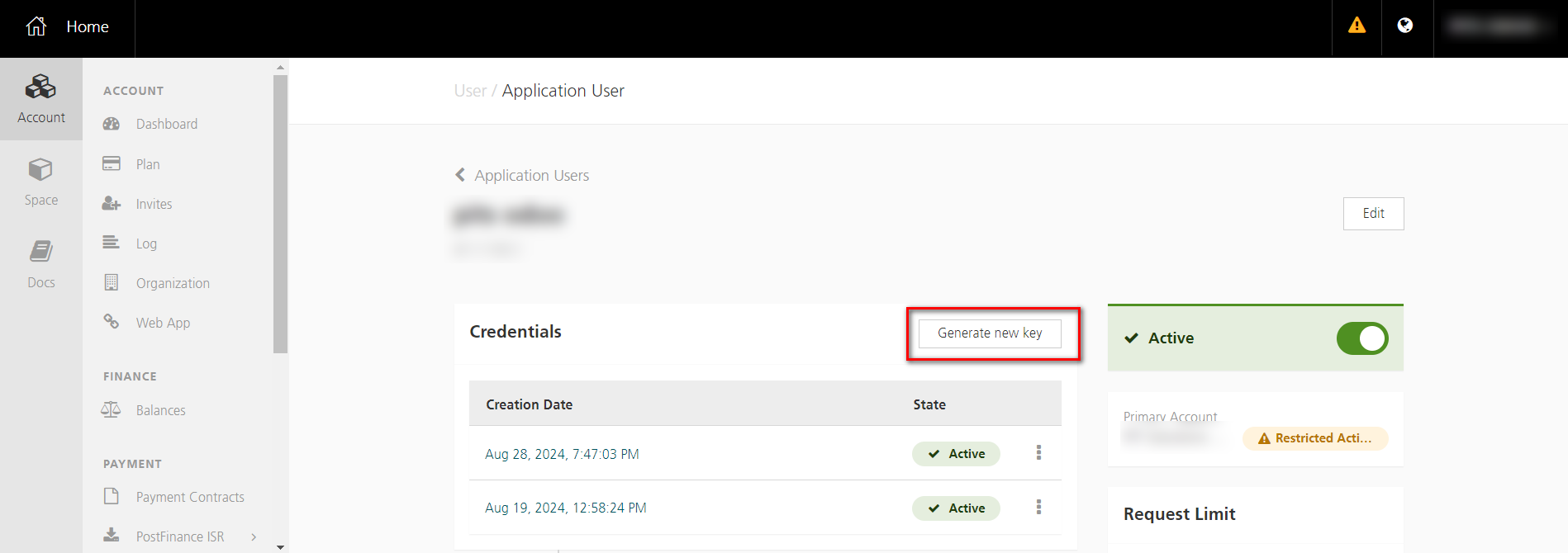 - Enter your User ID, Space ID, and Application Key from your PostFinance Flex account.
