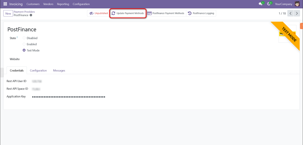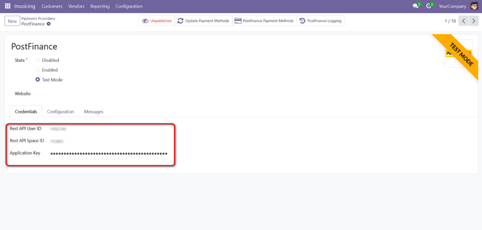 - Enter the Rest API UserID, Rest API Space ID and Application Key to PostFinance payment provider configuration in Odoo backend.