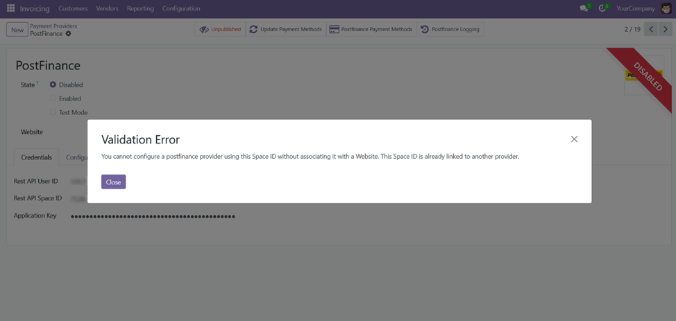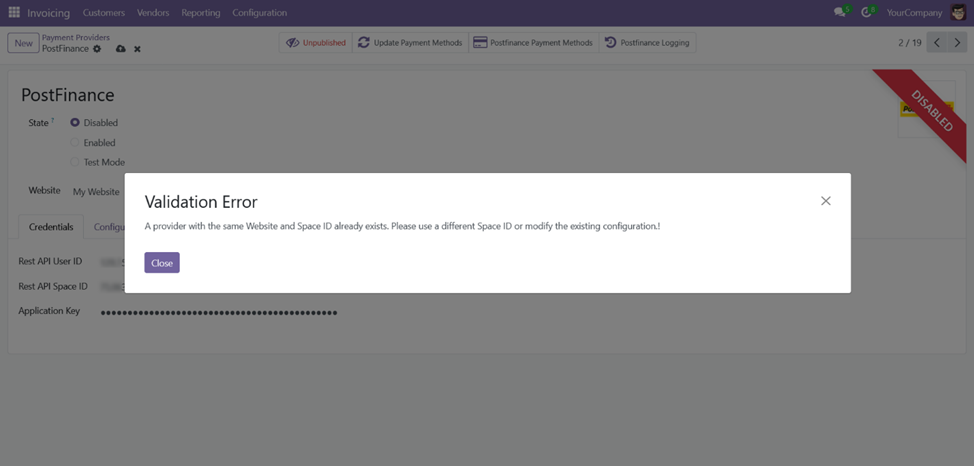 If a provider with the same combination of Website and Space ID is already configured, the system will raise a warning. This prevents duplication and ensures consistency across payment configurations.